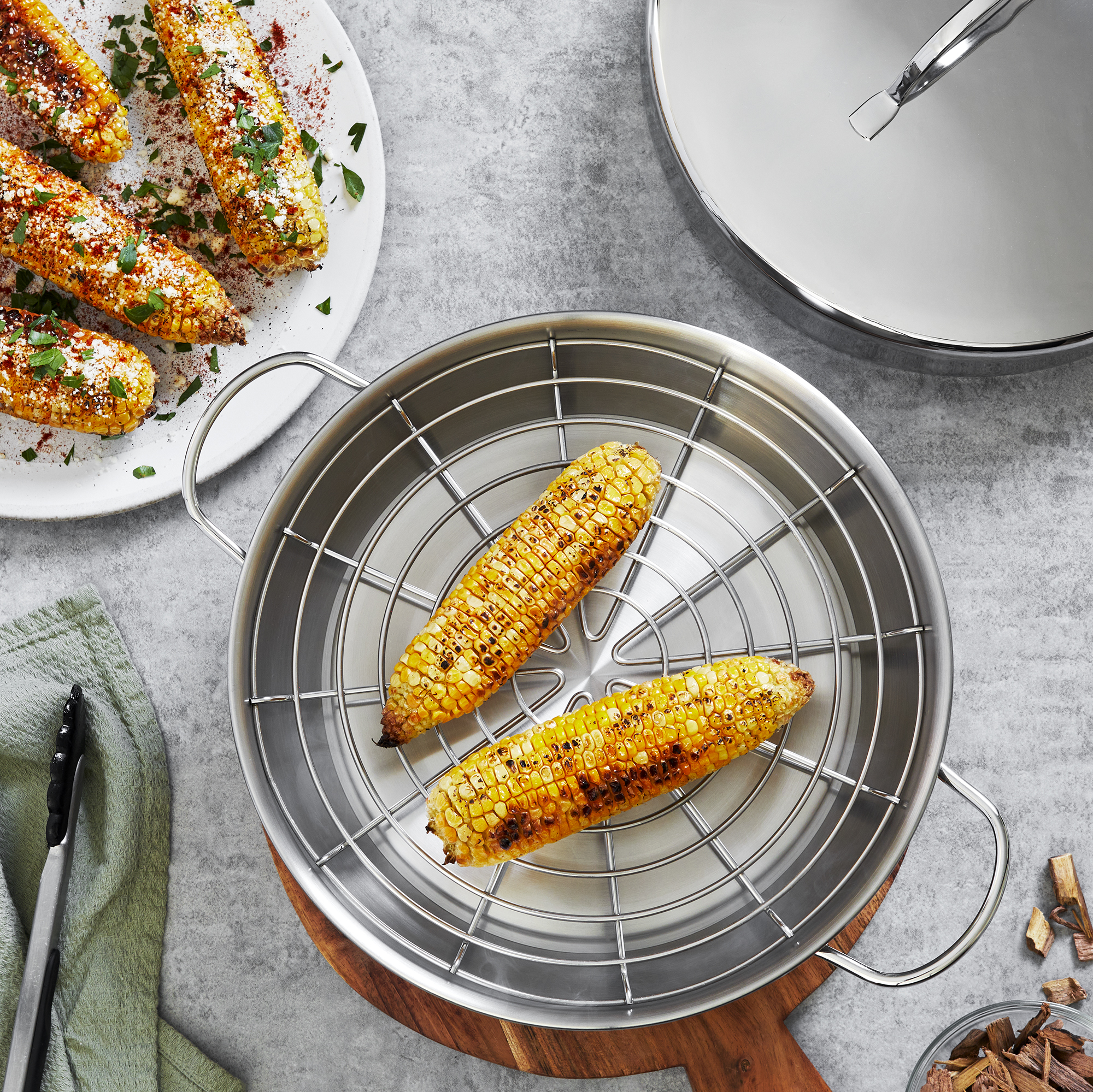 Set pentru afumat alimente, marca Demeyere28 cm diametru, din inox 18/10 Cr-Ni (crom-nichel), cu manere sudate din inox.