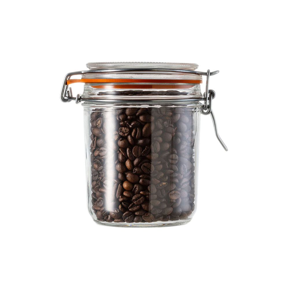 Borcan, marca Borgonovo, fabricat din sticla. Dispune de capac cu inchidere etansa ce prezinta garnitura din silicon si mecanism de inchidere metalic.