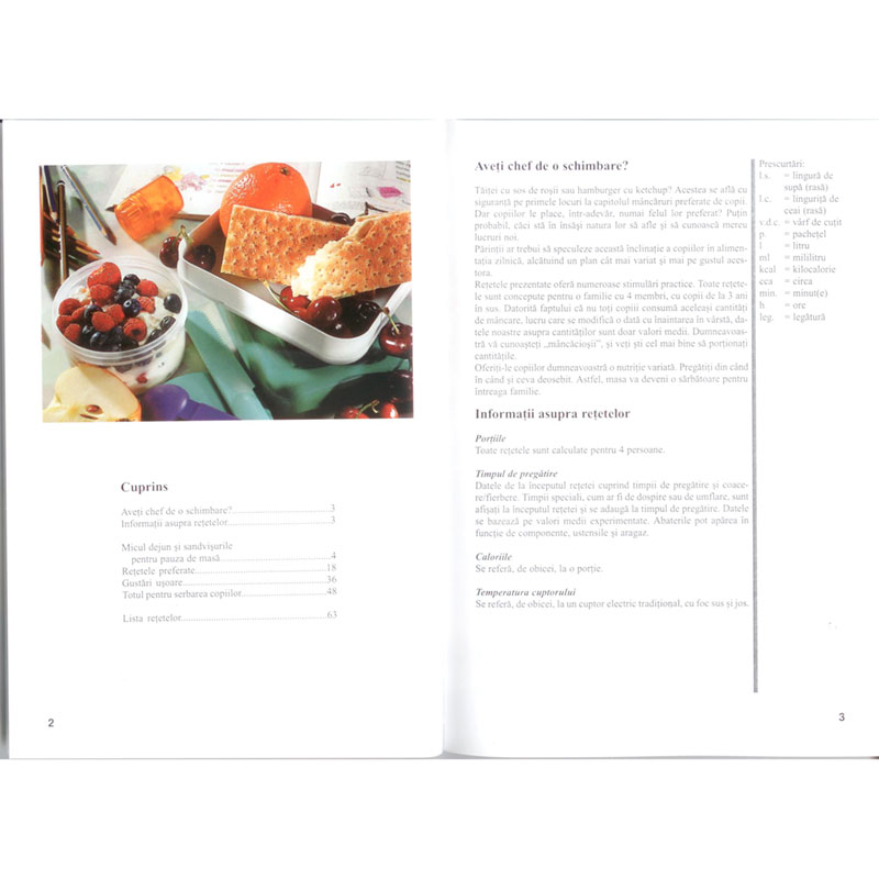 Aici gasiti retete culinare pentru micul dejun si pauza de masa, gustari usoare si totul pentru serbarea copiilor. Astfel, masa va deveni o sarbatoare pentru intreaga familie.