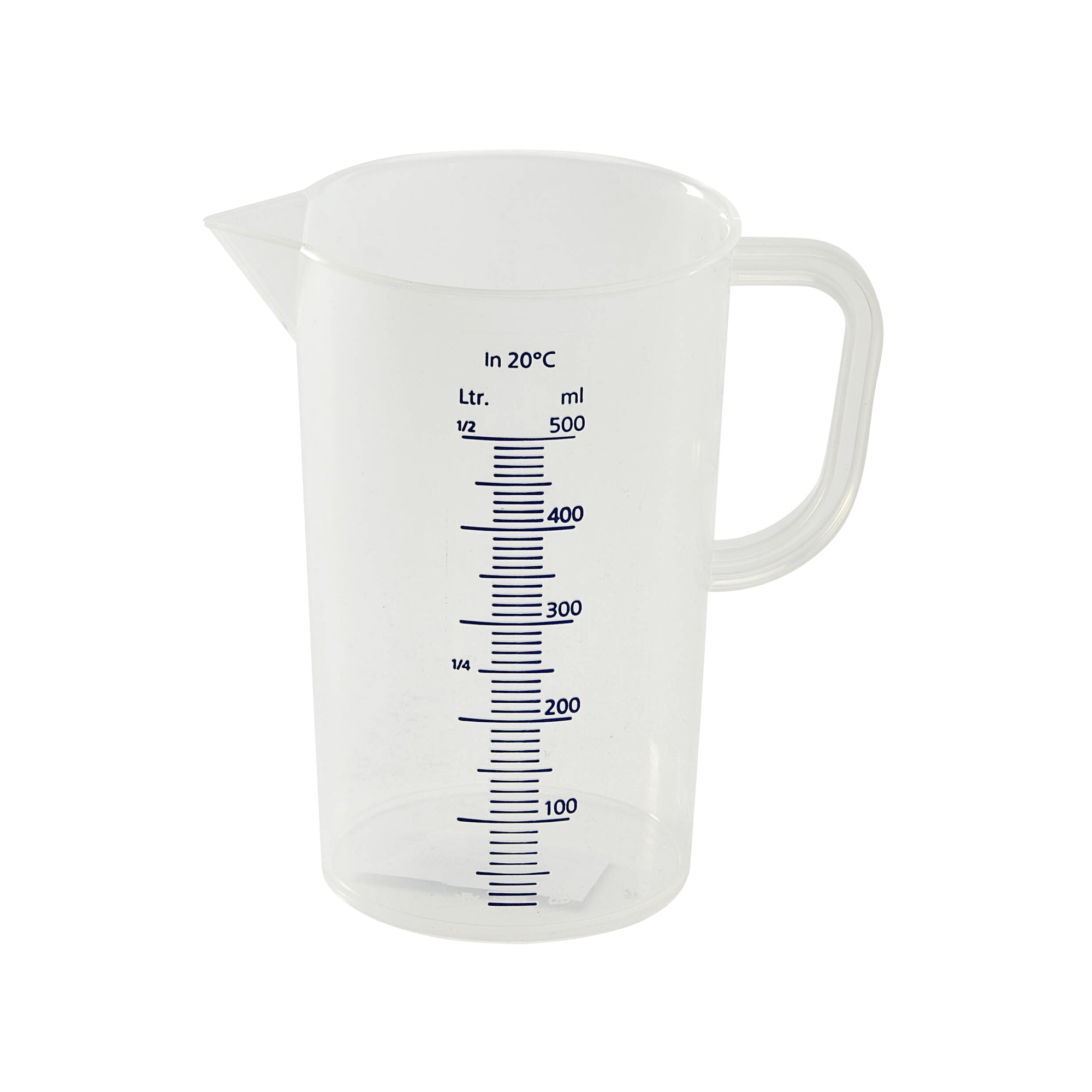 Cana transparenta pentru masurare, marca de Buyer, 9 cm diametru, 14 cm inaltime, ce poate masura pana la 500 ml, din polipropilena cu marcaje albastre.