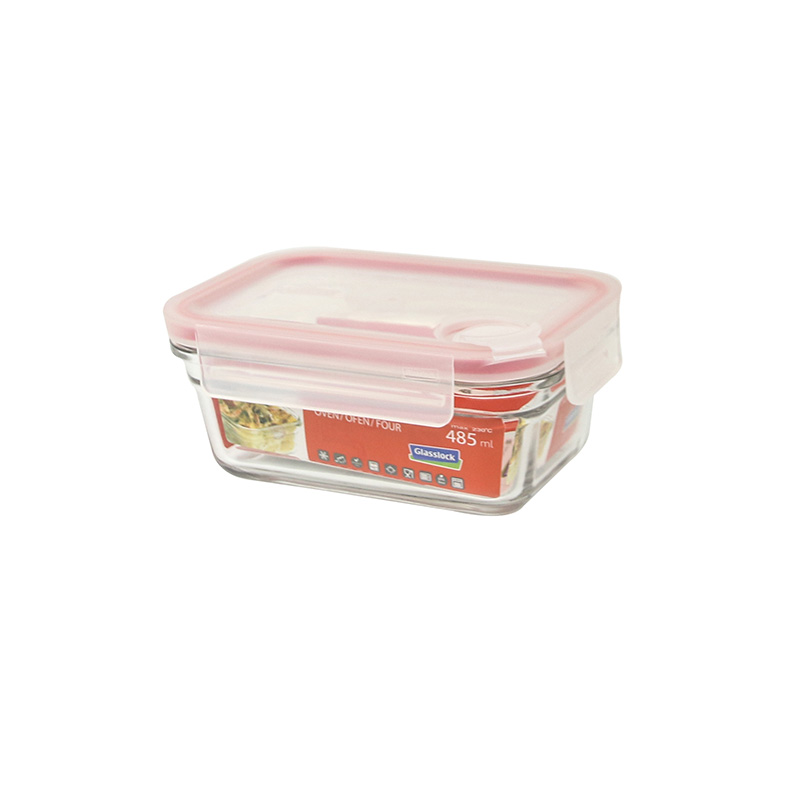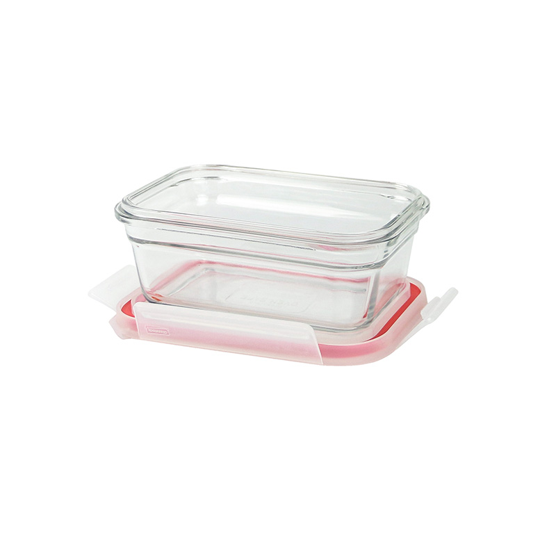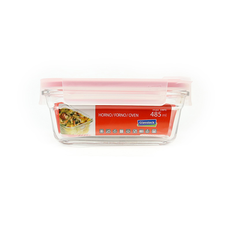 Caserola dreptunghiulara cu capac, marca Glasslock, 485 ml capacitate, dimensiuni 14,8 x 9,9 x 5,7 cm, din sticla temperata, rezistenta la temperaturi intre -20 si +230°C.