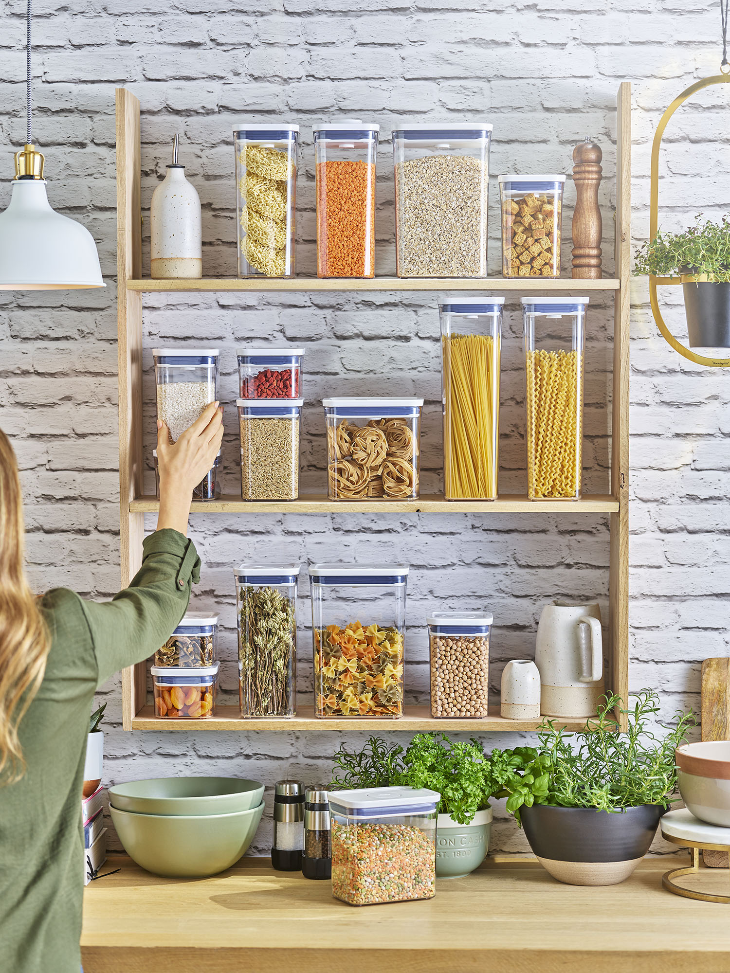 Caserola patrata, gama "POP", marca OXO, fabricata din plastic fara BPA transparent pentru a putea vedea cu usurinta ce se afla la interior.