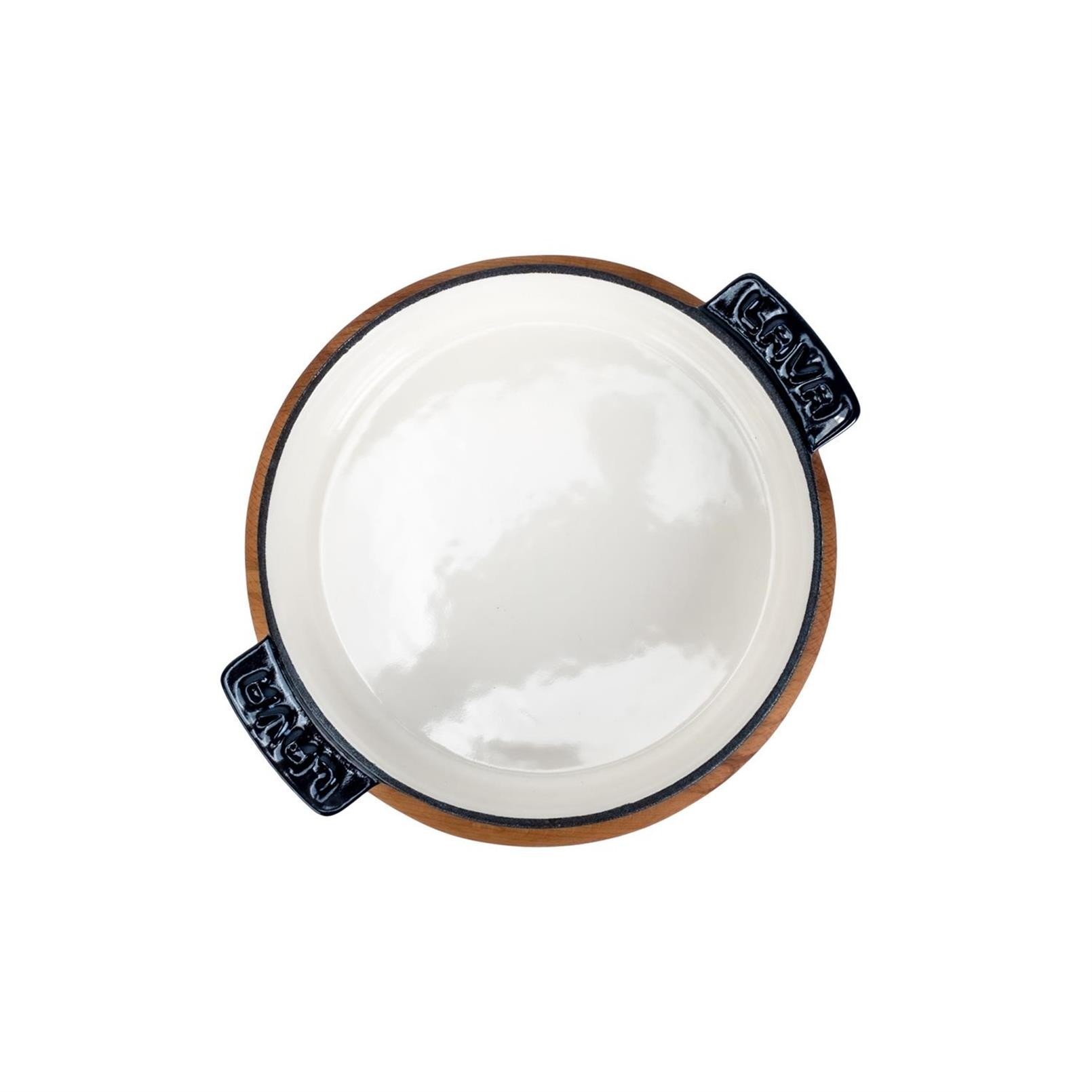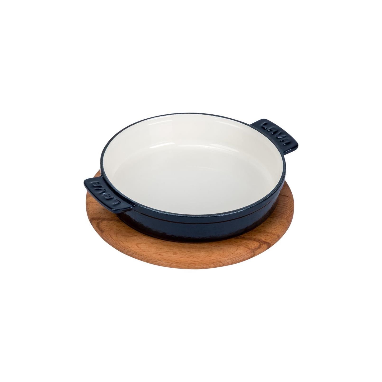 Mini cratita rotunda cu suport, marca Lava, diametru 11 cm, 0,22 l capacitate, fabricata din fonta. Suportul este fabricat din lemn de fag, si are un diametru de 12 cm.