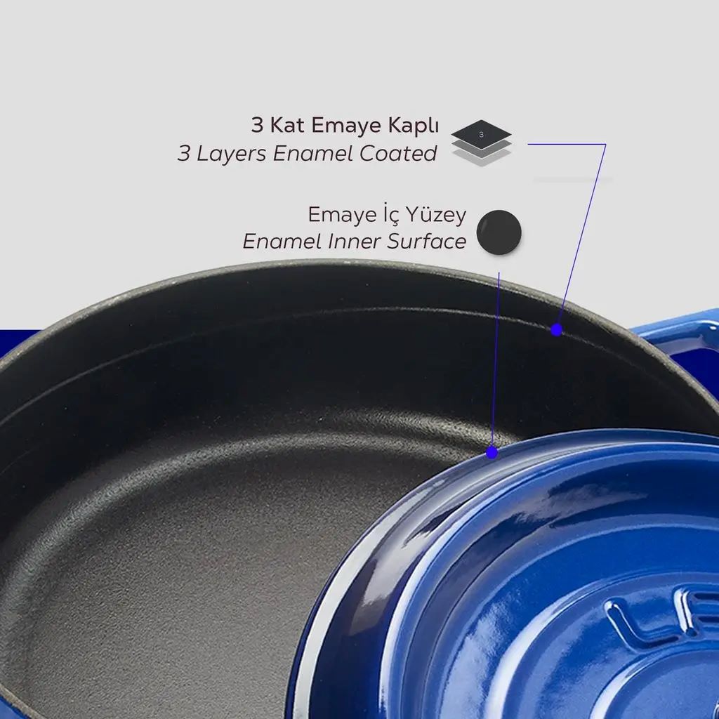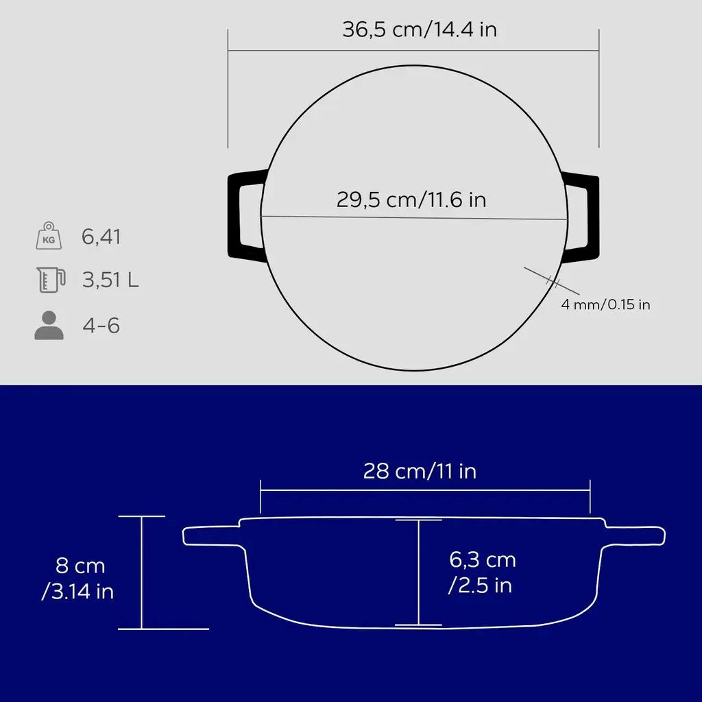 Peretii vasului au o grosime de 4 mm. In interior, vasul prezinta un strat de email negru ce faciliteaza crearea unei suprafete antiadezive atunci cand se gateste folosind grasimi.