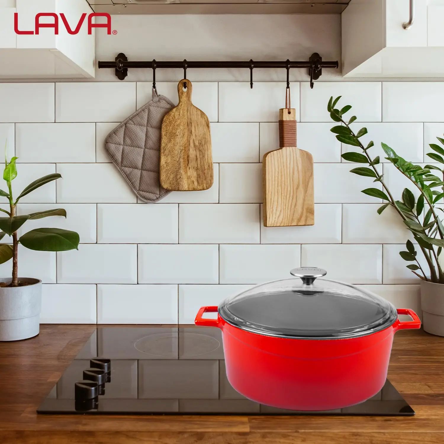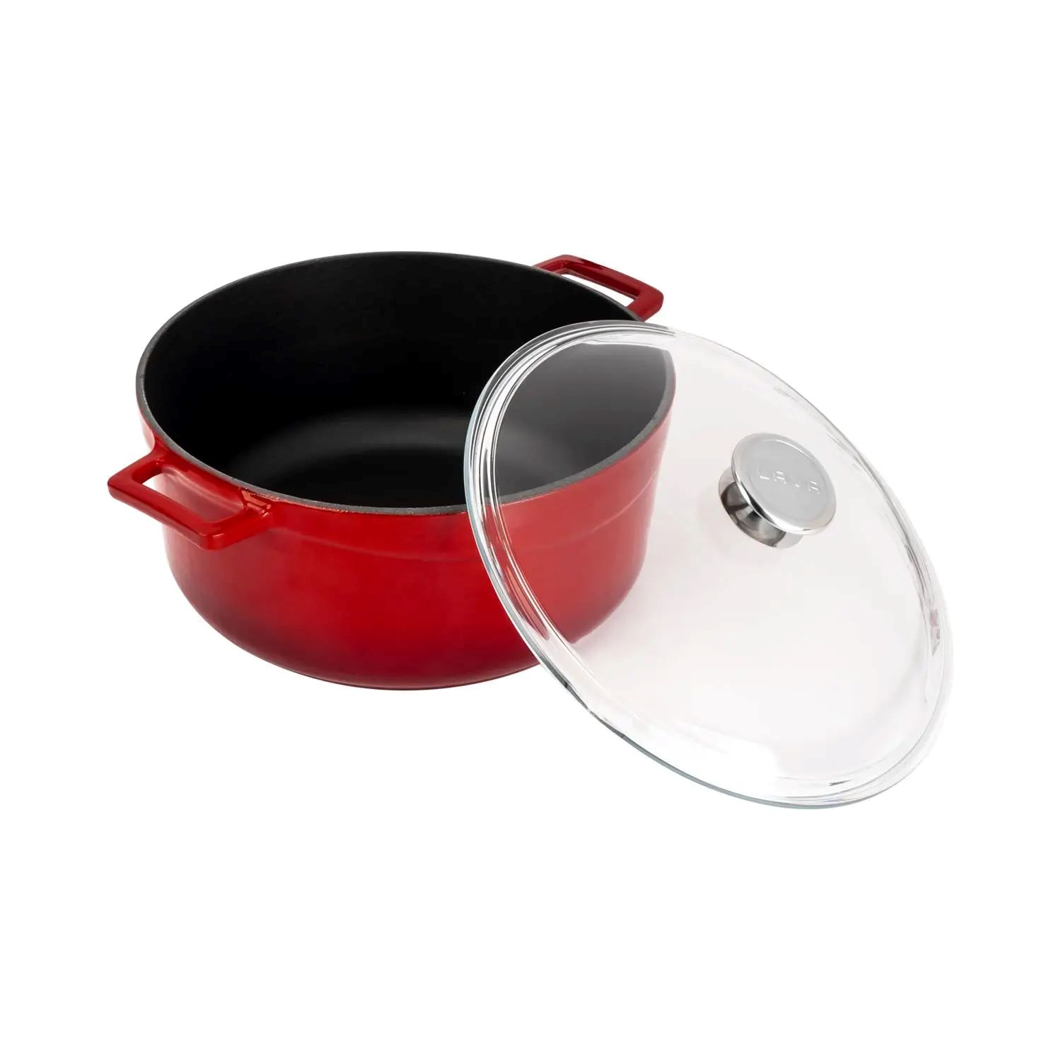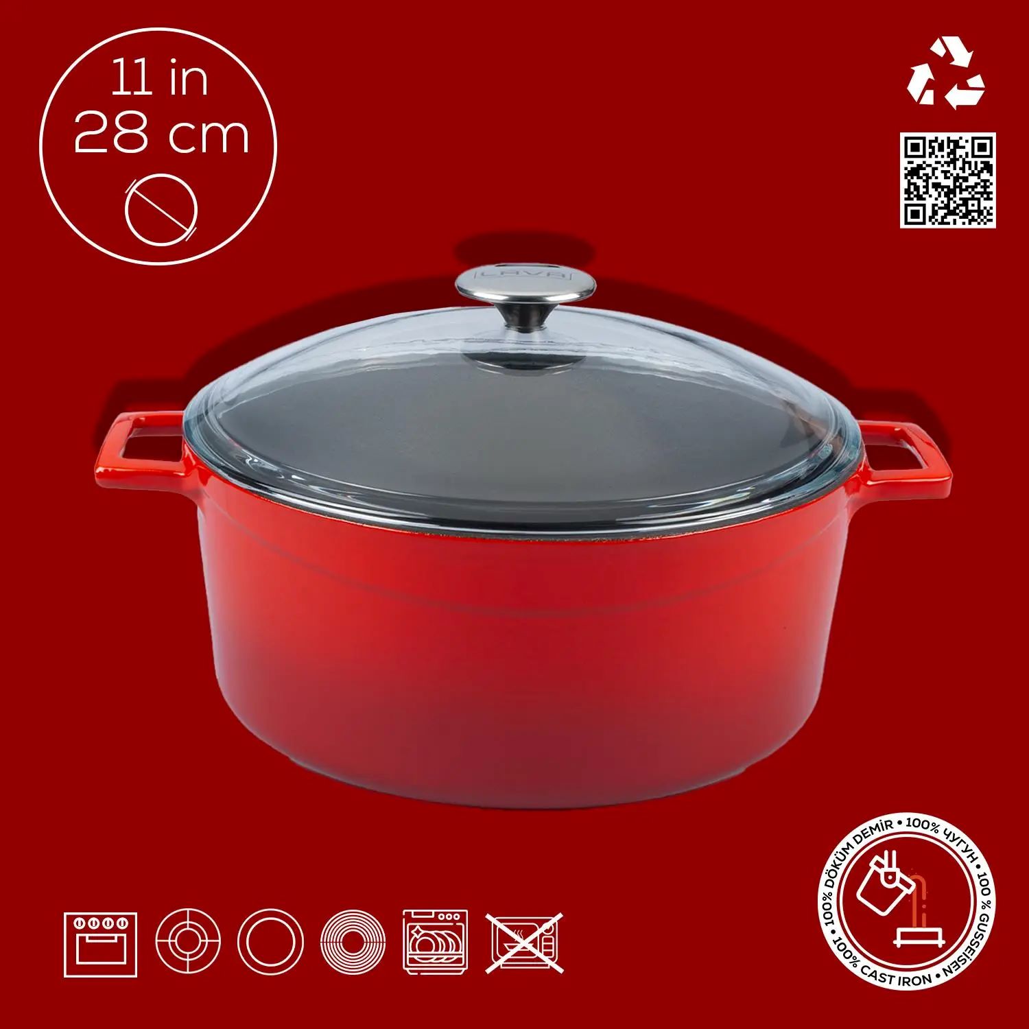 Cratita cu capac, marca Lava, diametru 28 cm, 6,7 l capacitate, fabricata din fonta si capac din sticla.