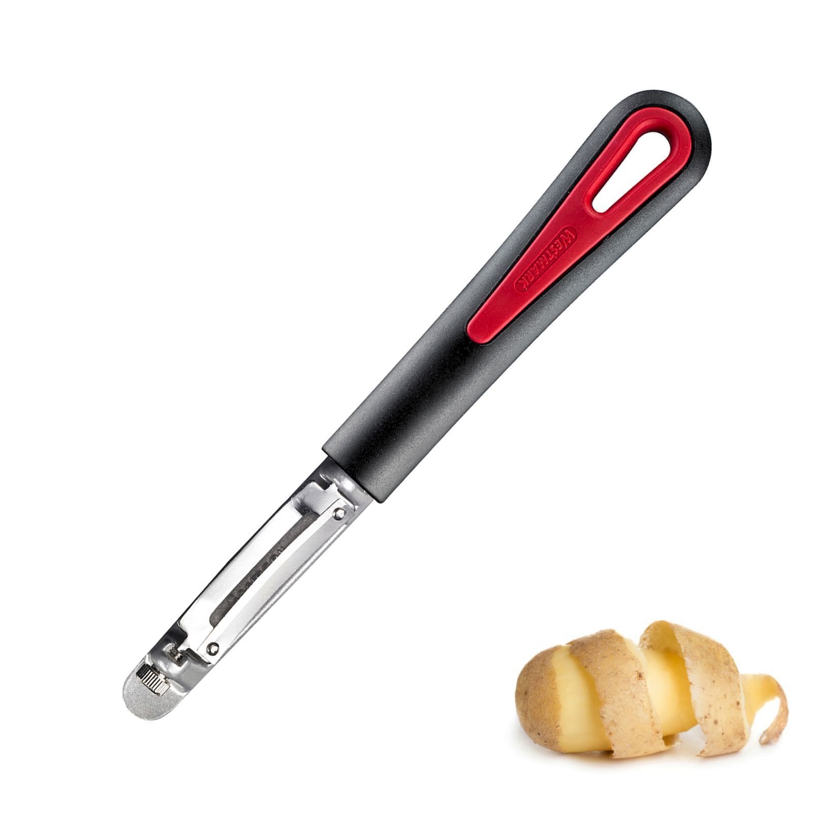 Ustensila pentru decojit, marca Westmark, cu lama pivotanta detasabila ce poate fi inlocuita si maner fabricat special pentru o prindere ferma. Poate fi folosit atat cu mana stanga cat si cu mana dreapta.