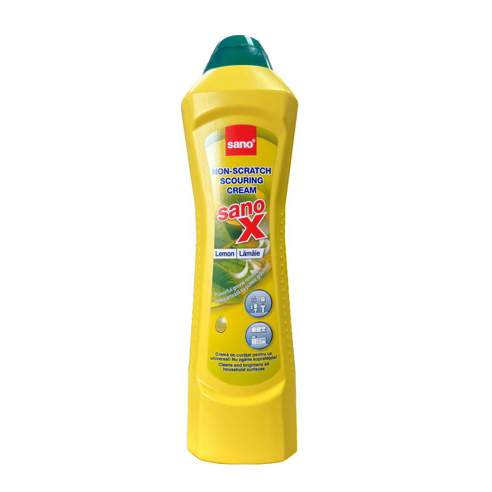 Detergentul pasta universal Sano X Cream Lemon este soluția ideala pentru a curata si a conferi strălucire suprafetelor murdare din baie si bucatarie, fara a le zgaria.