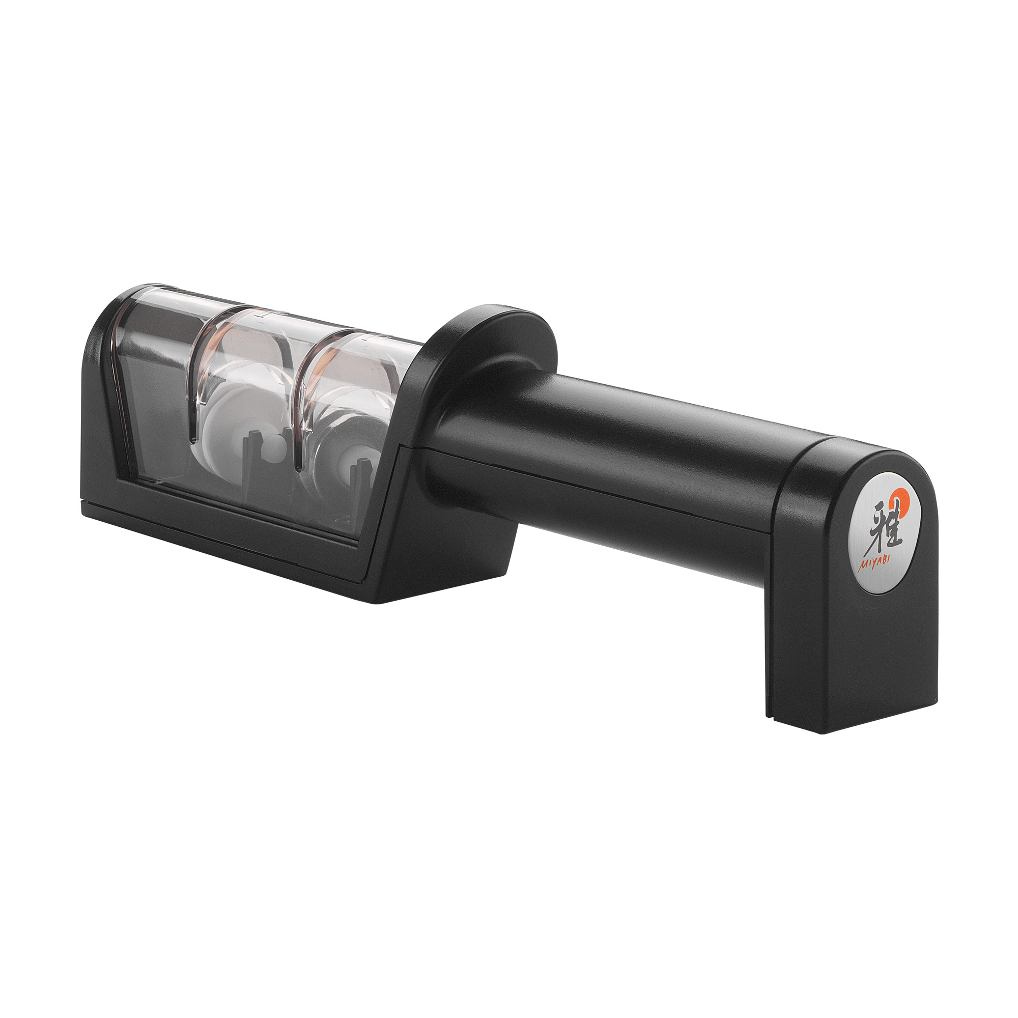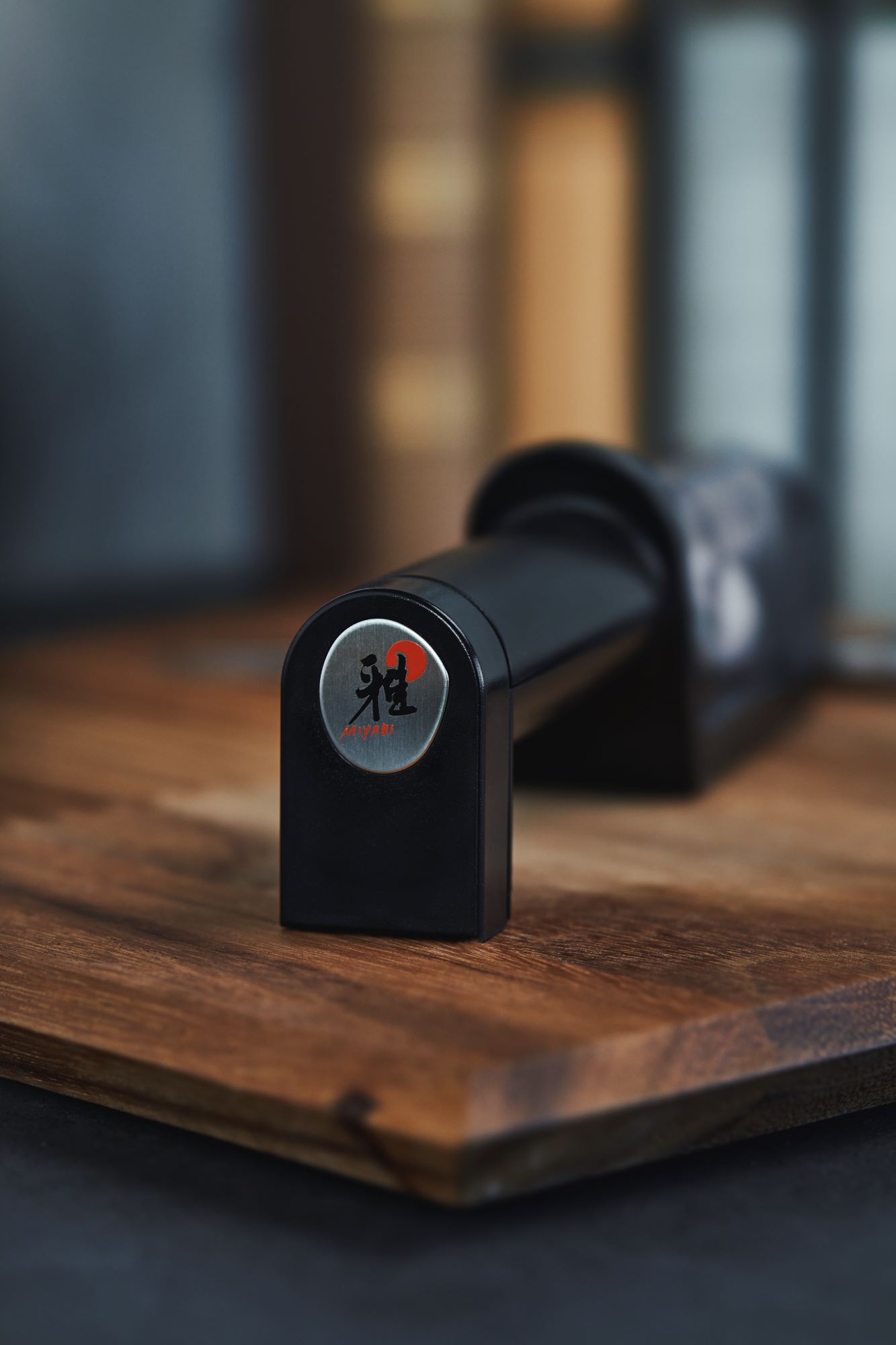 Dispozitiv pentru ascutit cutite, marca Miyabi, din material sintetic de culoare neagra.