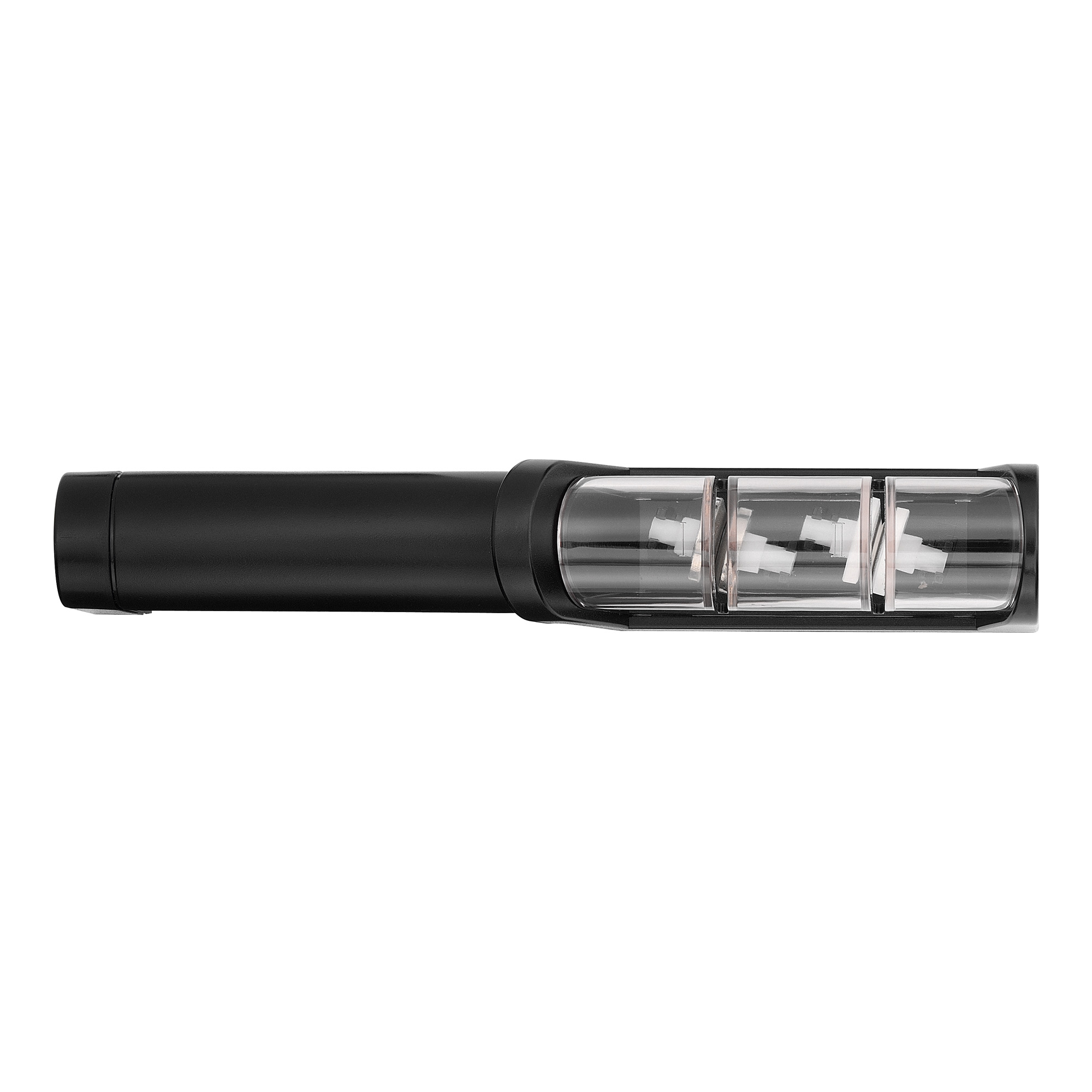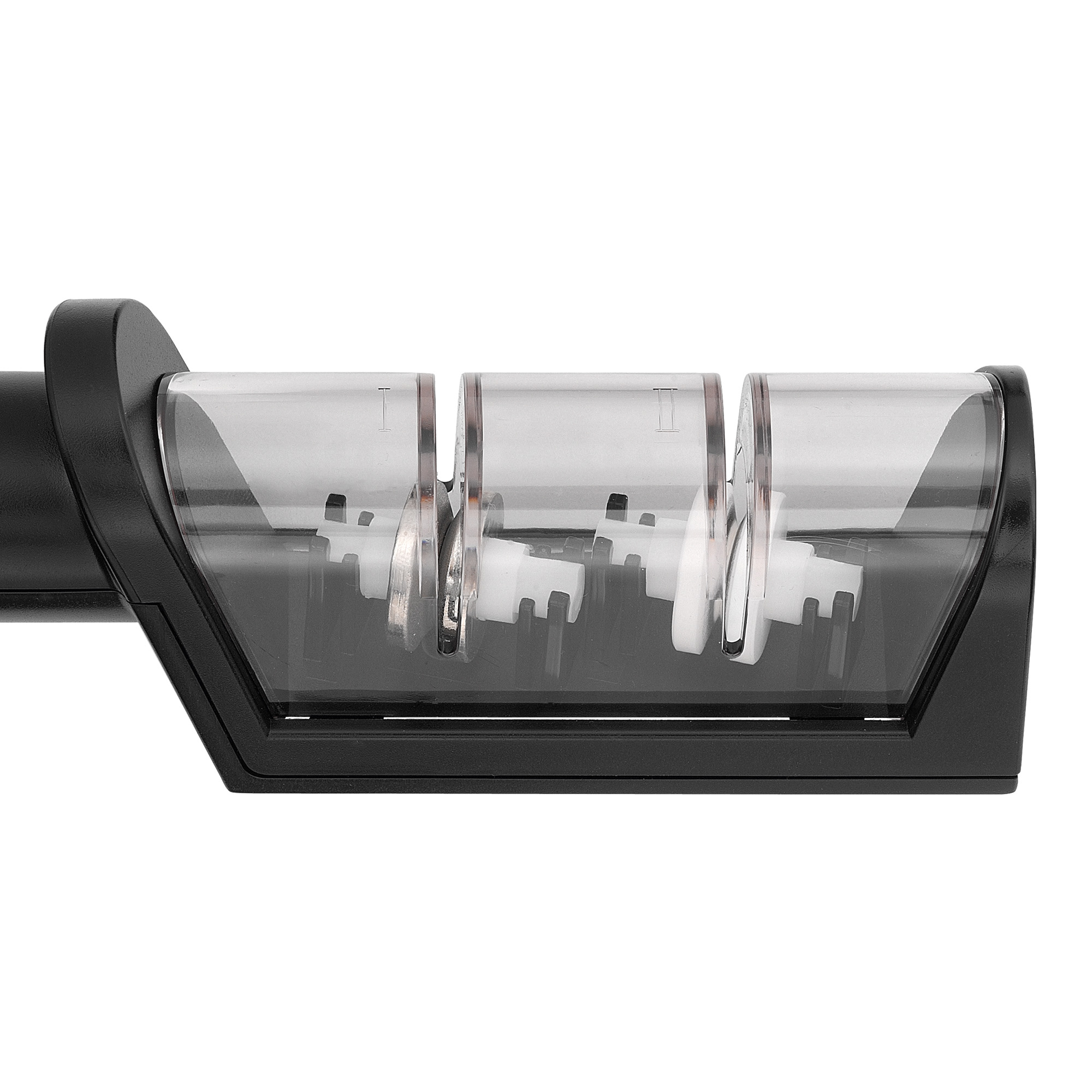 Are 4 elemente abrazive montate in paralel 2 cate 2 in compartimentul de ascutire: 2 din otel acoperit cu diamante pentru slefuirea taisului si 2 din ceramica de culoare alba, pentru finisare.