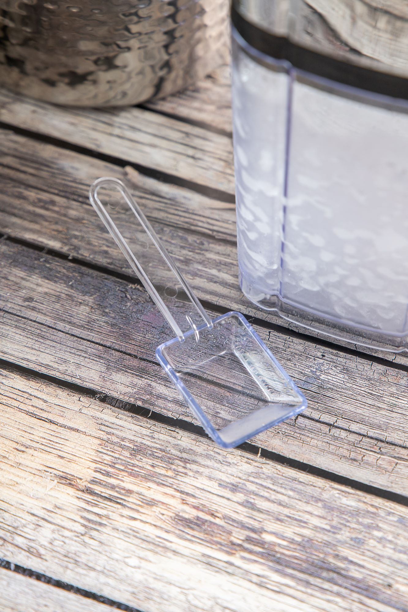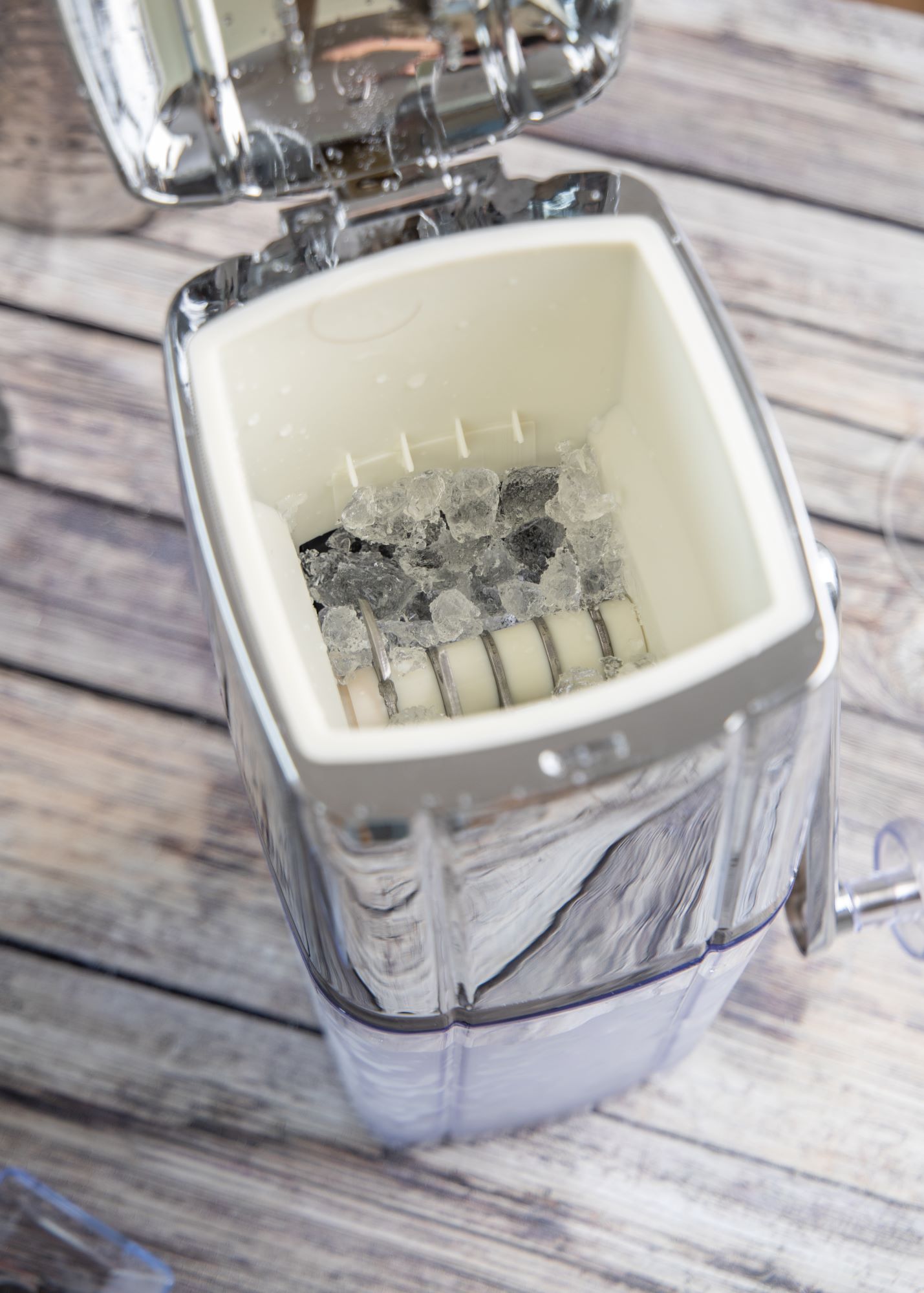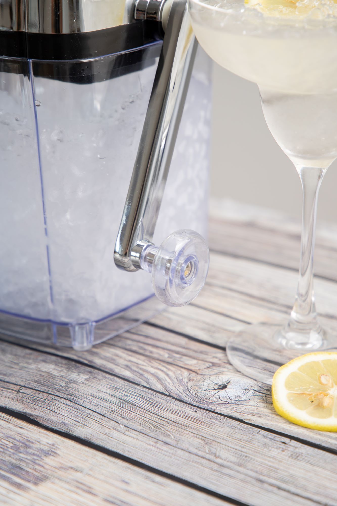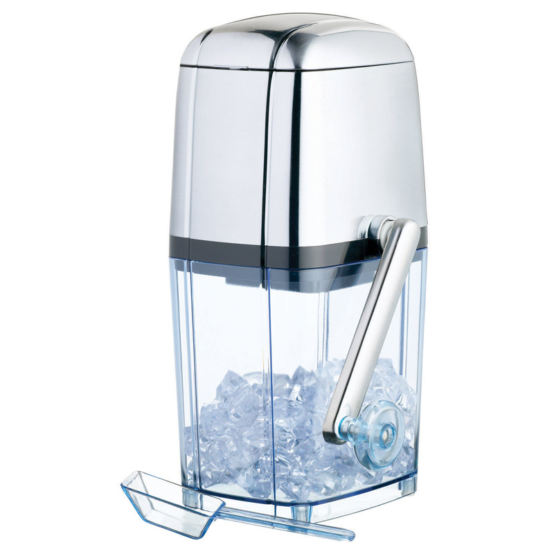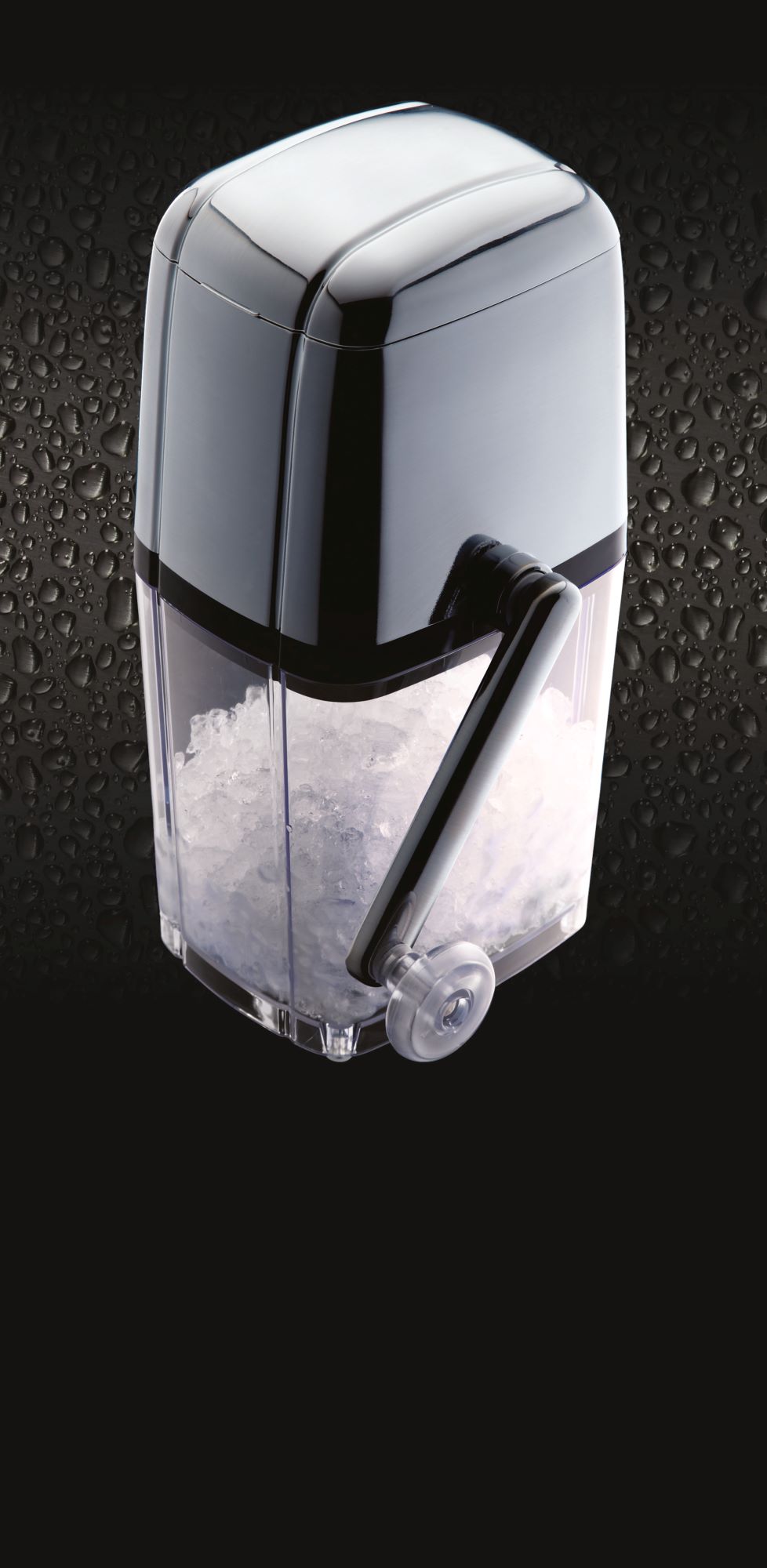 Prezinta un sistem de maruntire actionat manual cu ajutorul unei manivele, un recipient de colectare a bucatilor de gheata si o cupa speciala pentru servit gheata.