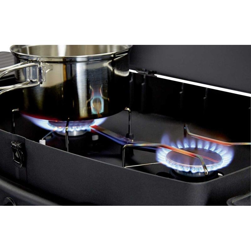 De la cotlete pana la pizza si chiar prajituri, grillul acesta mobil acopera mai multe stiluri de gatire a alimentelor. Cele doua arzatoare din otel inoxidabil, de sub capacul de aluminiu turnat, ofera cele mai bune conditii pentru gatirea alimentelor prin frigere, prajire sau coacere. Grilele cromate si suprafata de gatire emailata angreneaza intreaga tehnologie superioara a grillului.
