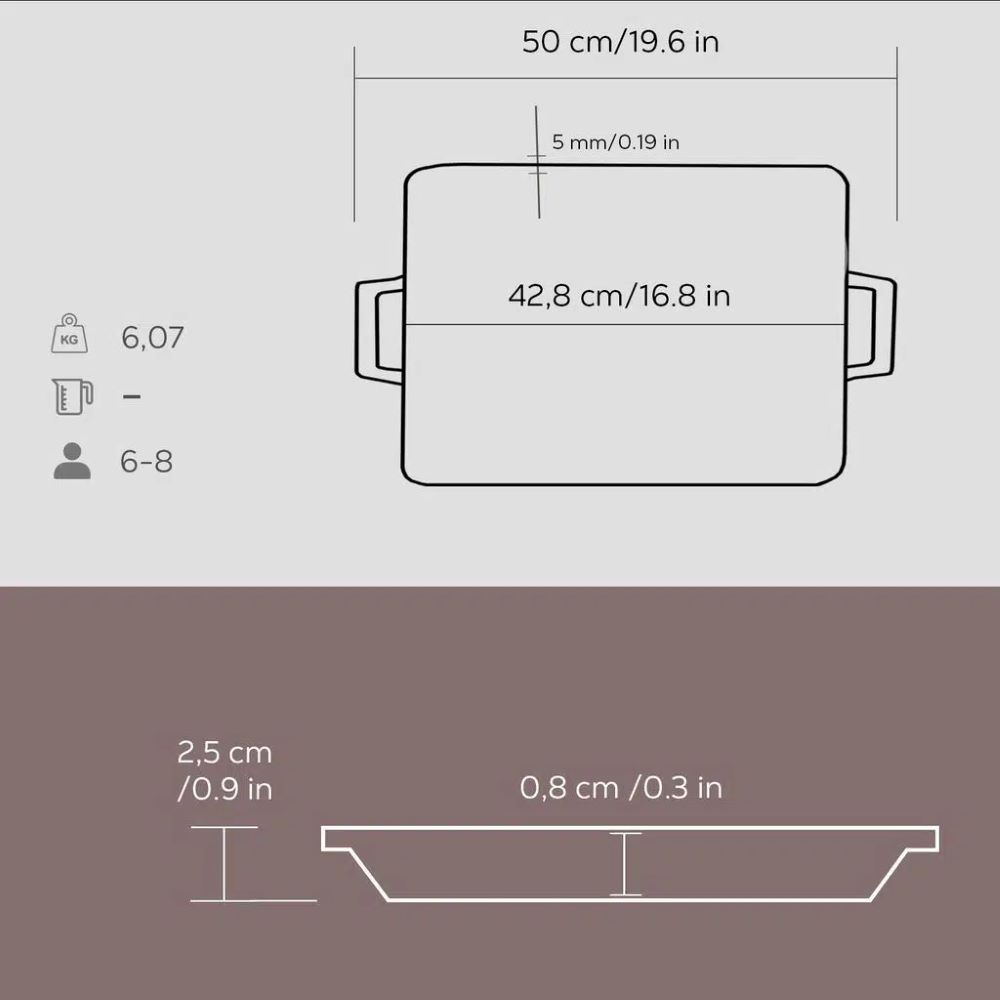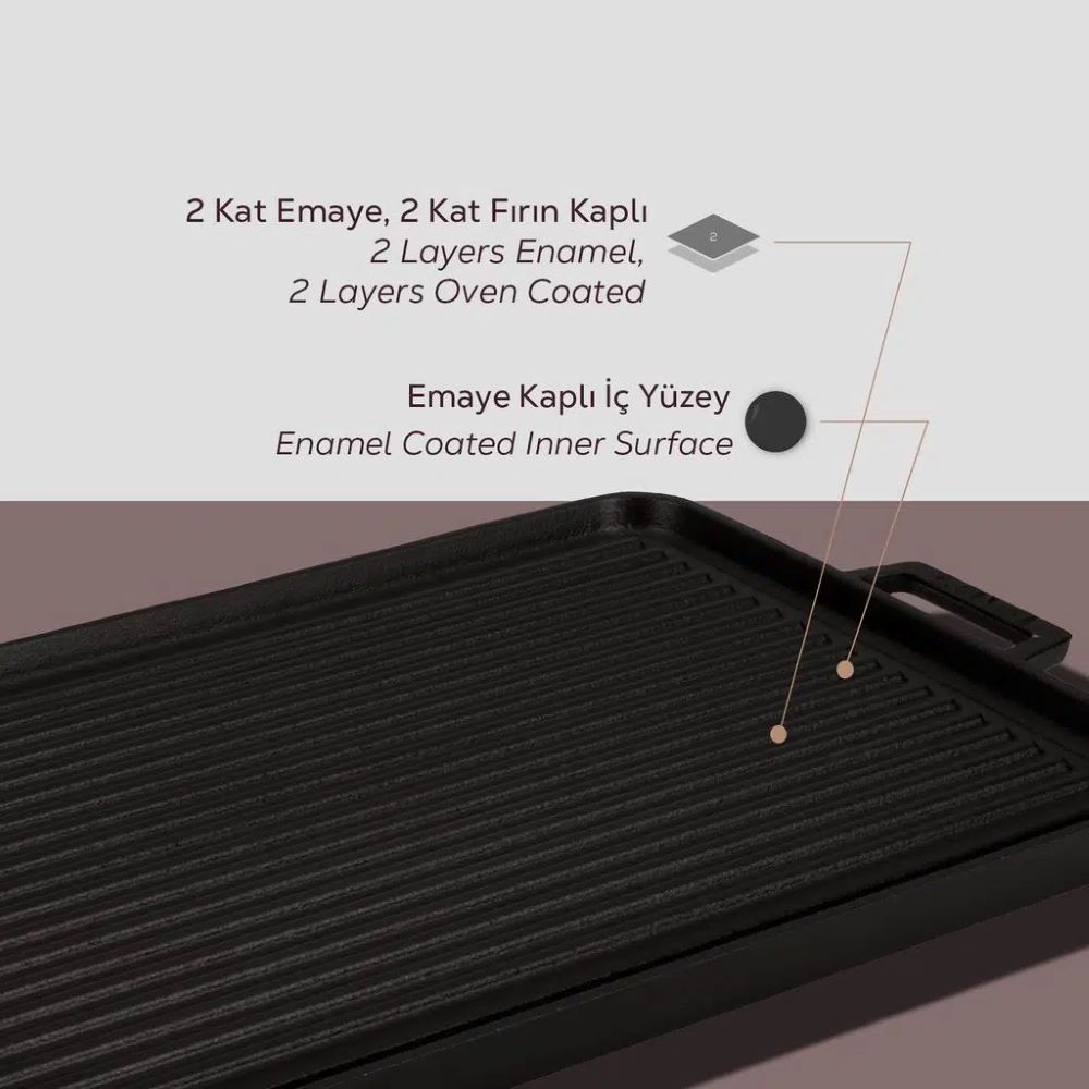Plita are o grosime de 5 mm in partea interioara si 3,5 mm pe margine. Produsul prezinta un strat de email negru ce faciliteaza crearea unei suprafete antiaderente atunci cand se gateste folosind grasimi.