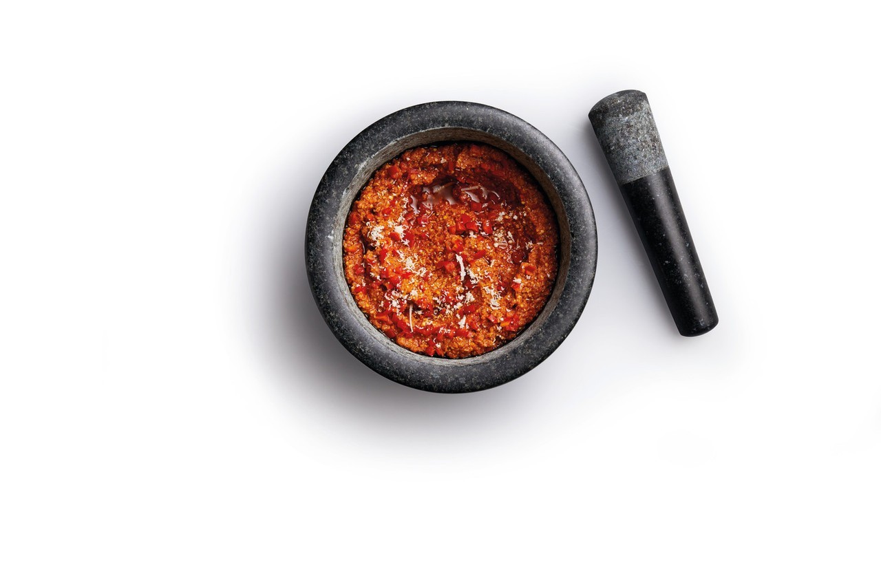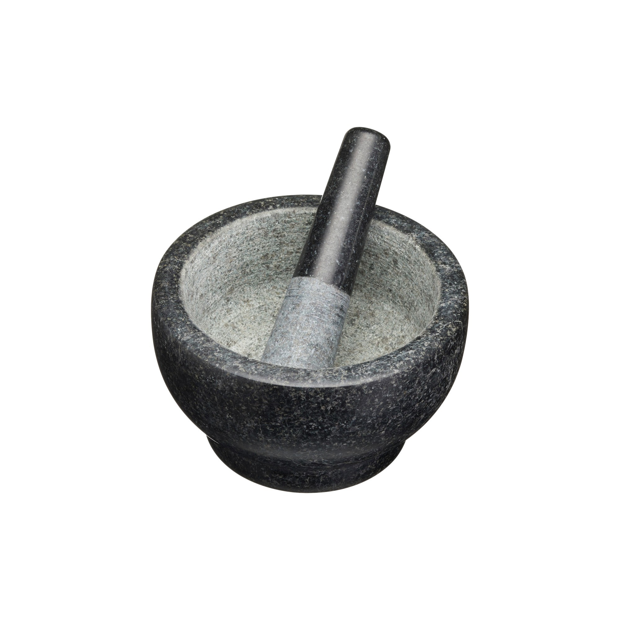 Mojar cu pistil, marca MasterClass, fabricat din marmura, dimensiuni 13 x 20 cm. Prezinta exterior lucios si interior rugos, pentru o amestecare usoara. De asemenea greutatea marmurii asigura o mai buna stabilitate in timpul utilizarii.