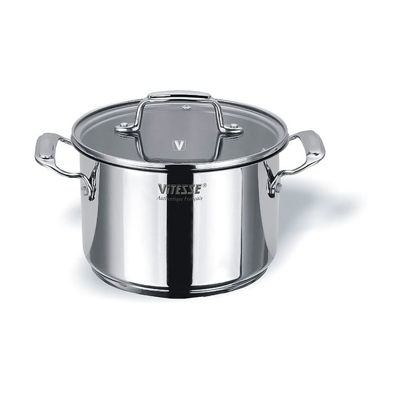 Oala gradata marca Vitesse din inox 18/10, de 24 cm diametru, 6,3 L capacitate, cu baza groasa multistratificata incapsulata din aluminiu dur cu proprietatea de termoacumulare (se incalzeste uniform si retine caldura timp indelungat).