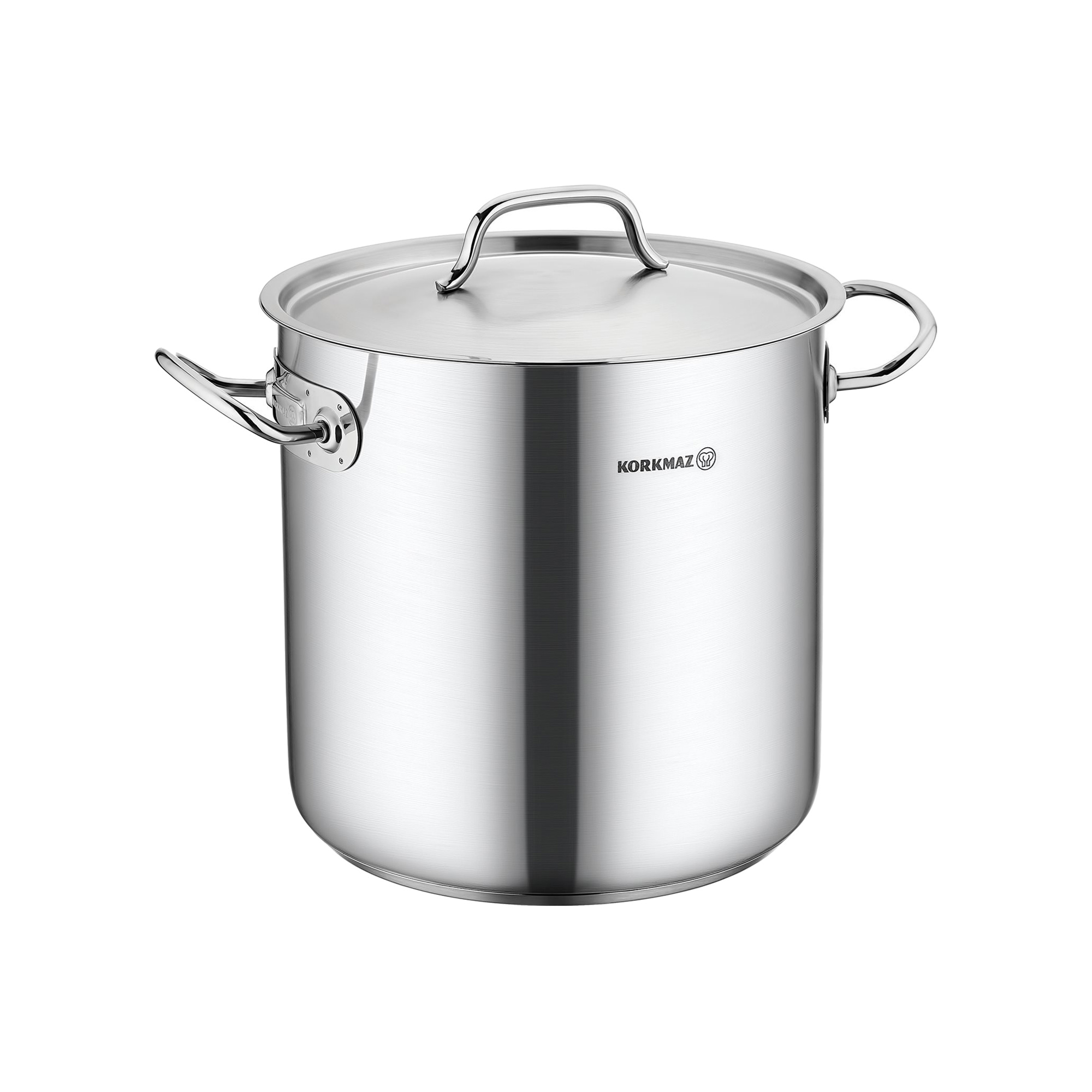 Oala cu capac, din inox 18/10 Cr-Ni (crom-nichel), marca Korkmaz, cu diametrul de 16 cm, inaltime 16 cm si capacitatea de 3 L.