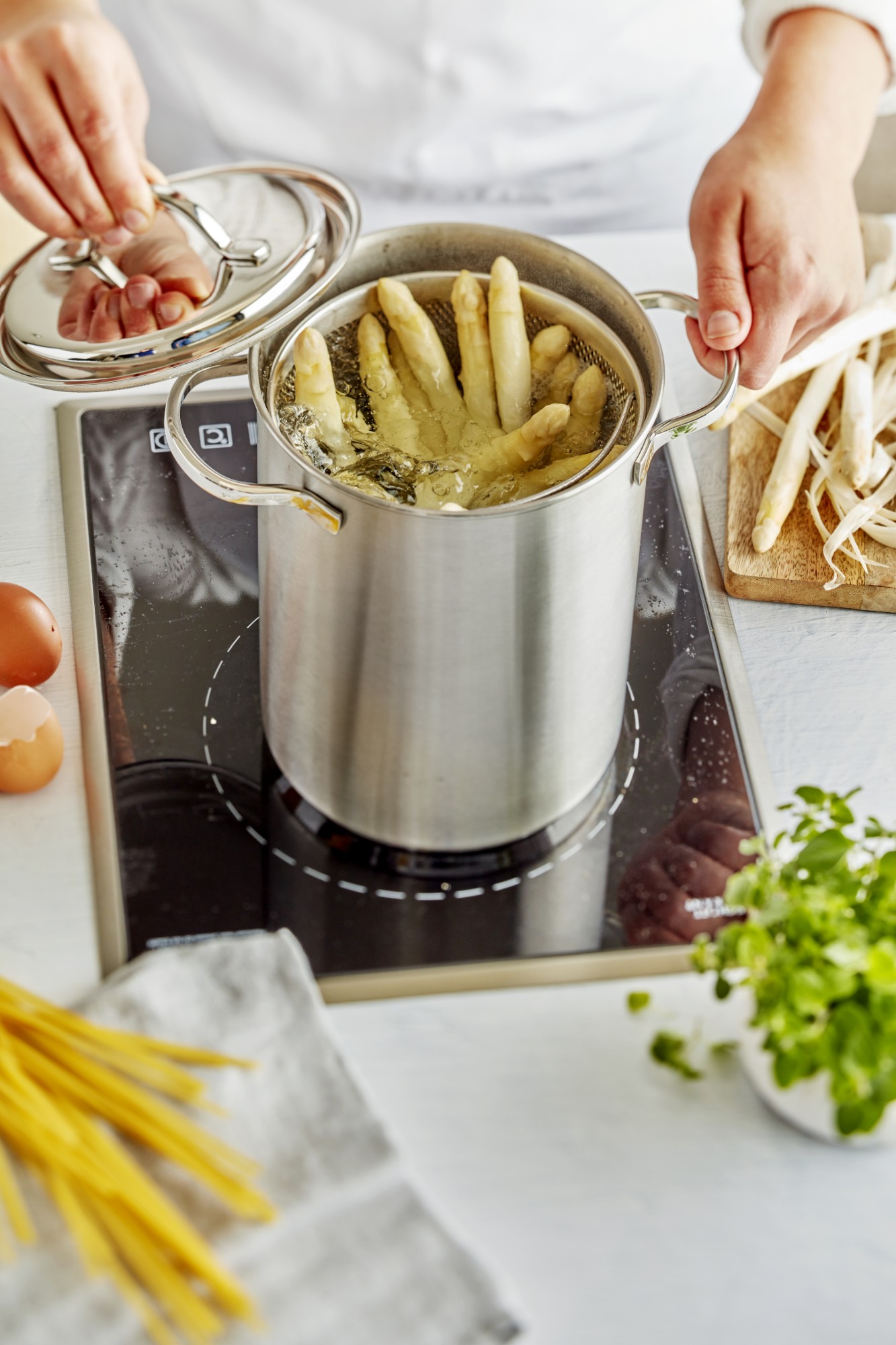 Setul de gatit Demeyere pentru sparanghel/paste este fabricat din inox 18/10 si include un capac si un cos de sparanghel cu scurgere. Acesta oala de sparanghel este unica deoarece pe langa gatirea verticala a sparanghelului, andivelor sau a altor legume este ideala si pentru prepararea pastelor. De asemenea, in aceasta oala puteti blansa, fierbe si gati alimente la abur.