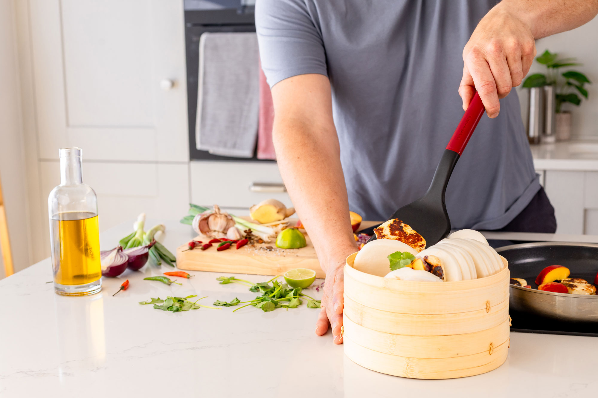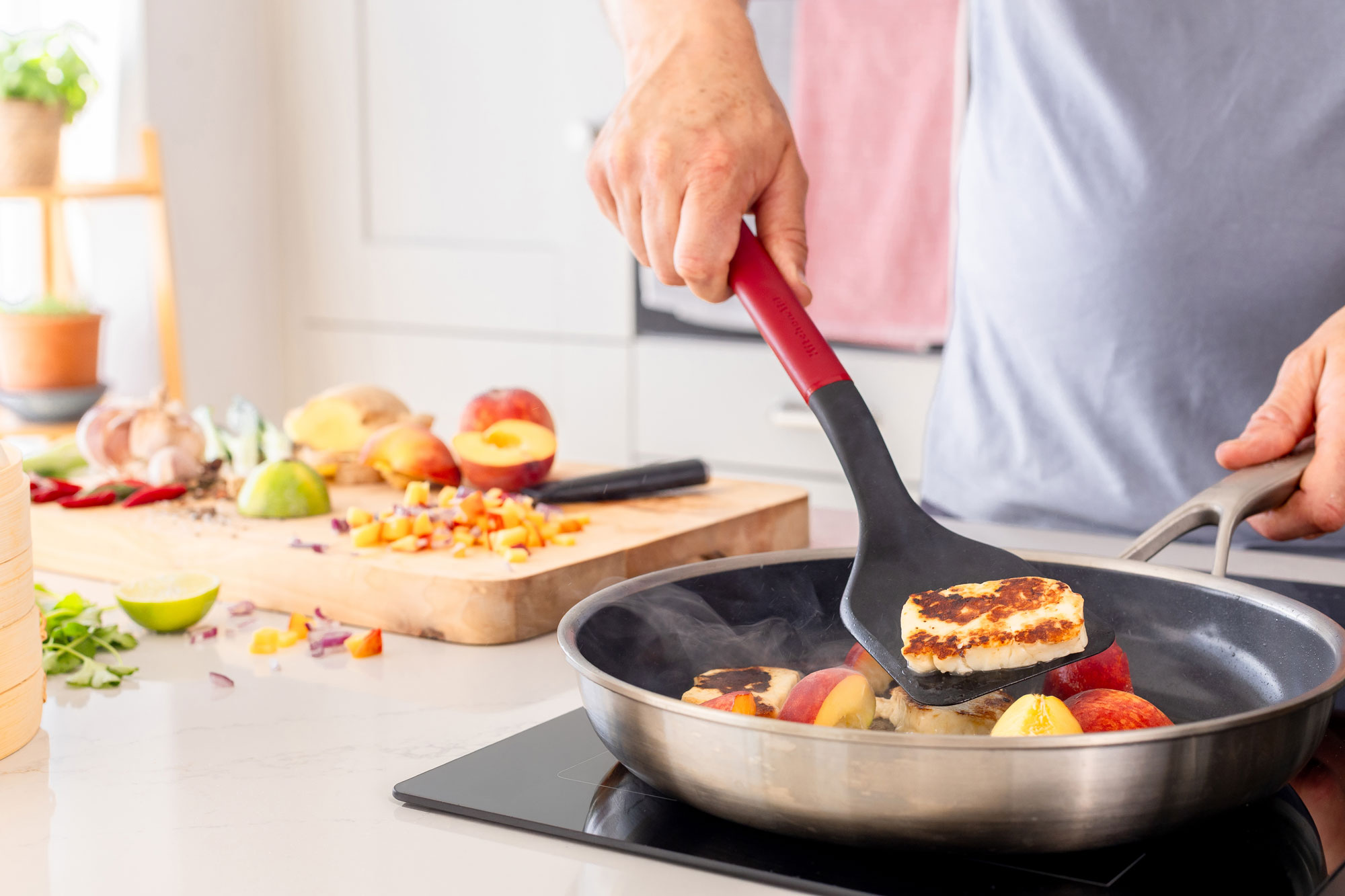 Capatul supradimensionat ofera o suprafata stabila pentru oua, clatite, burgeri si multe altele, fiind rezistent la caldura pana la 232°C/450°F.