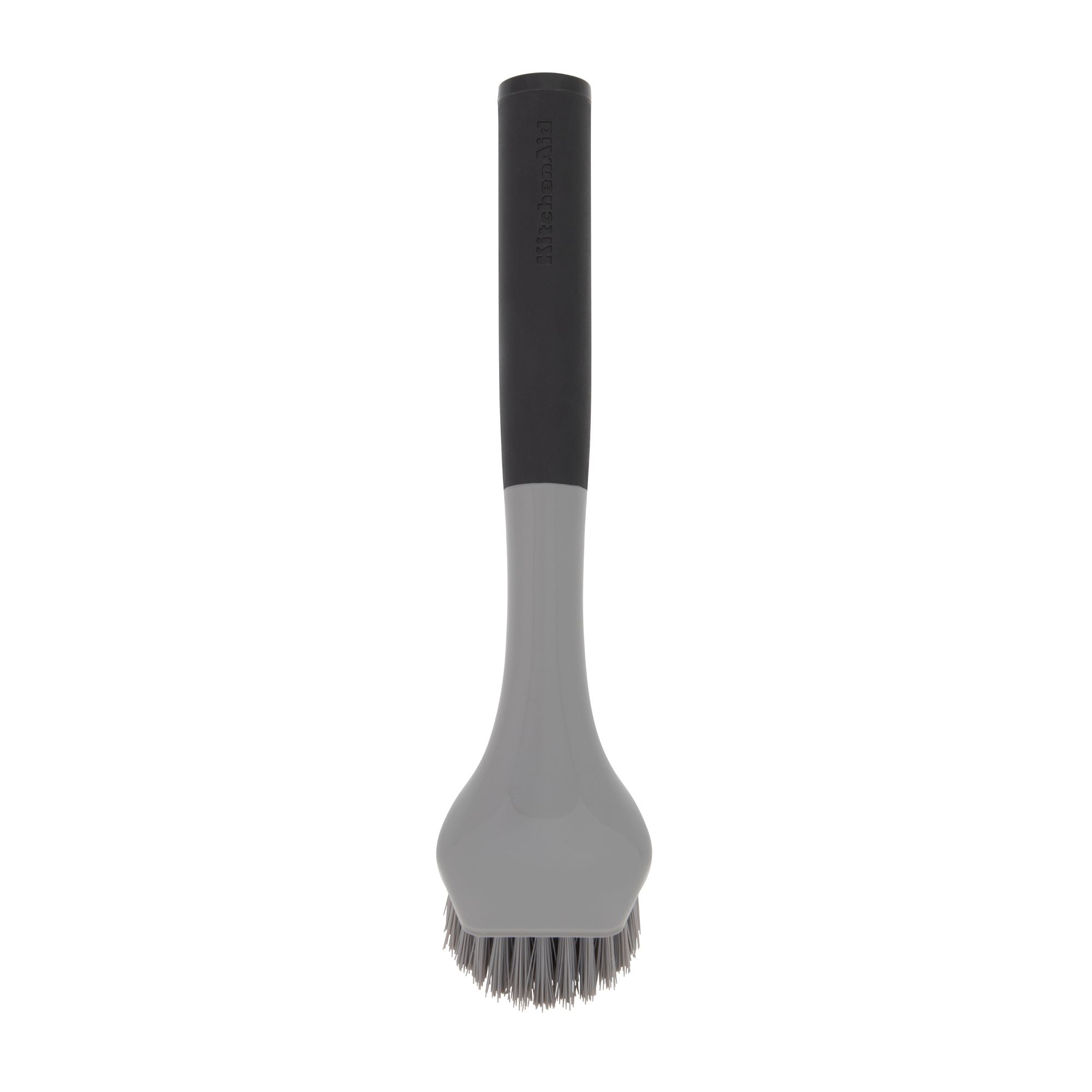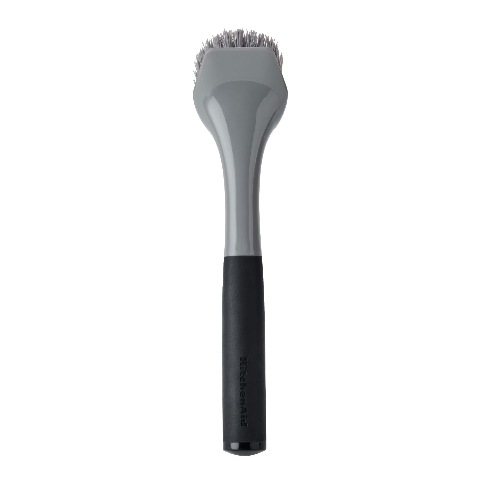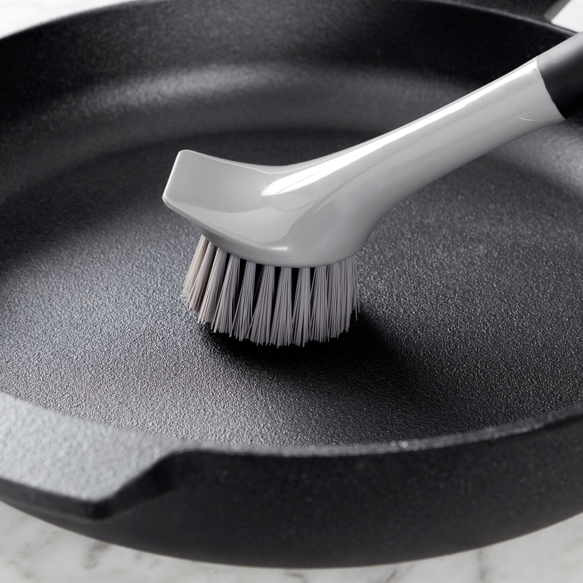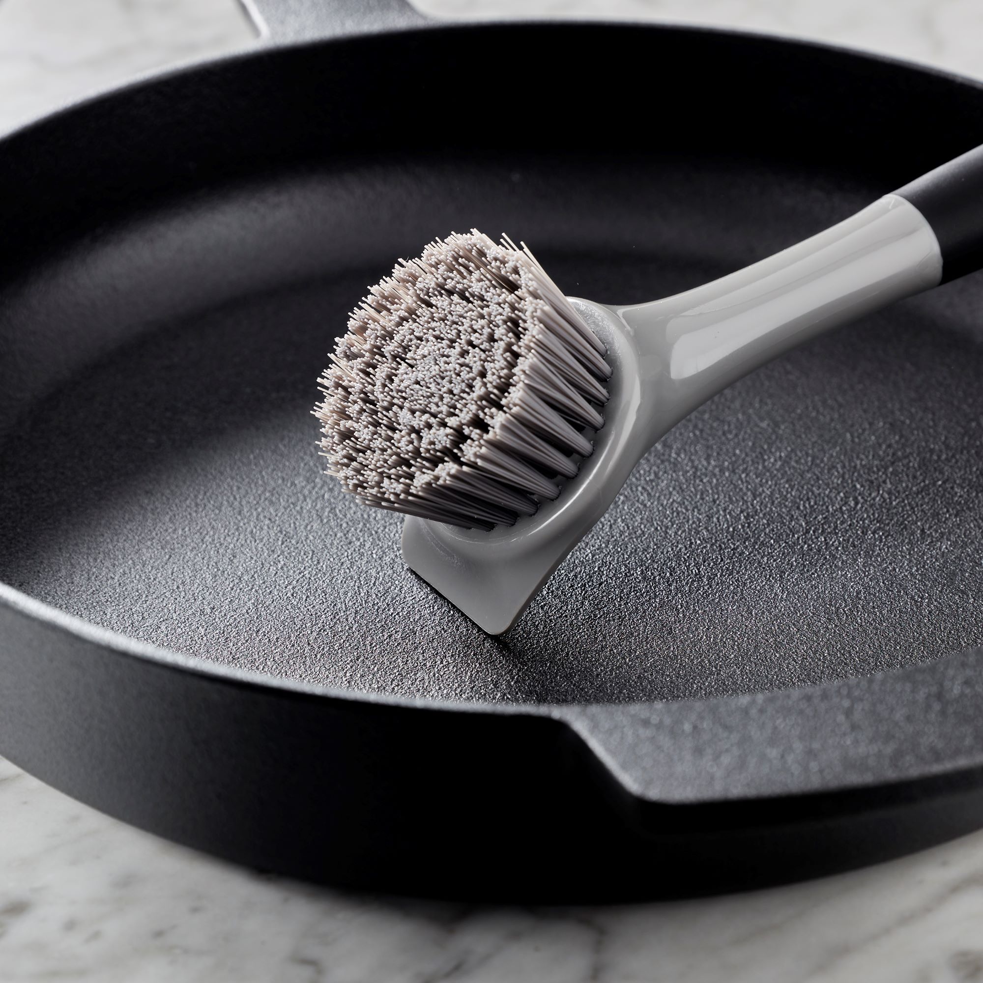 Indepartati resturile alimentare persistente de pe suprafata oalelor si tigailor din fonta, cu peria de spalat vase, marca KitchenAid, fabricata din plastic.