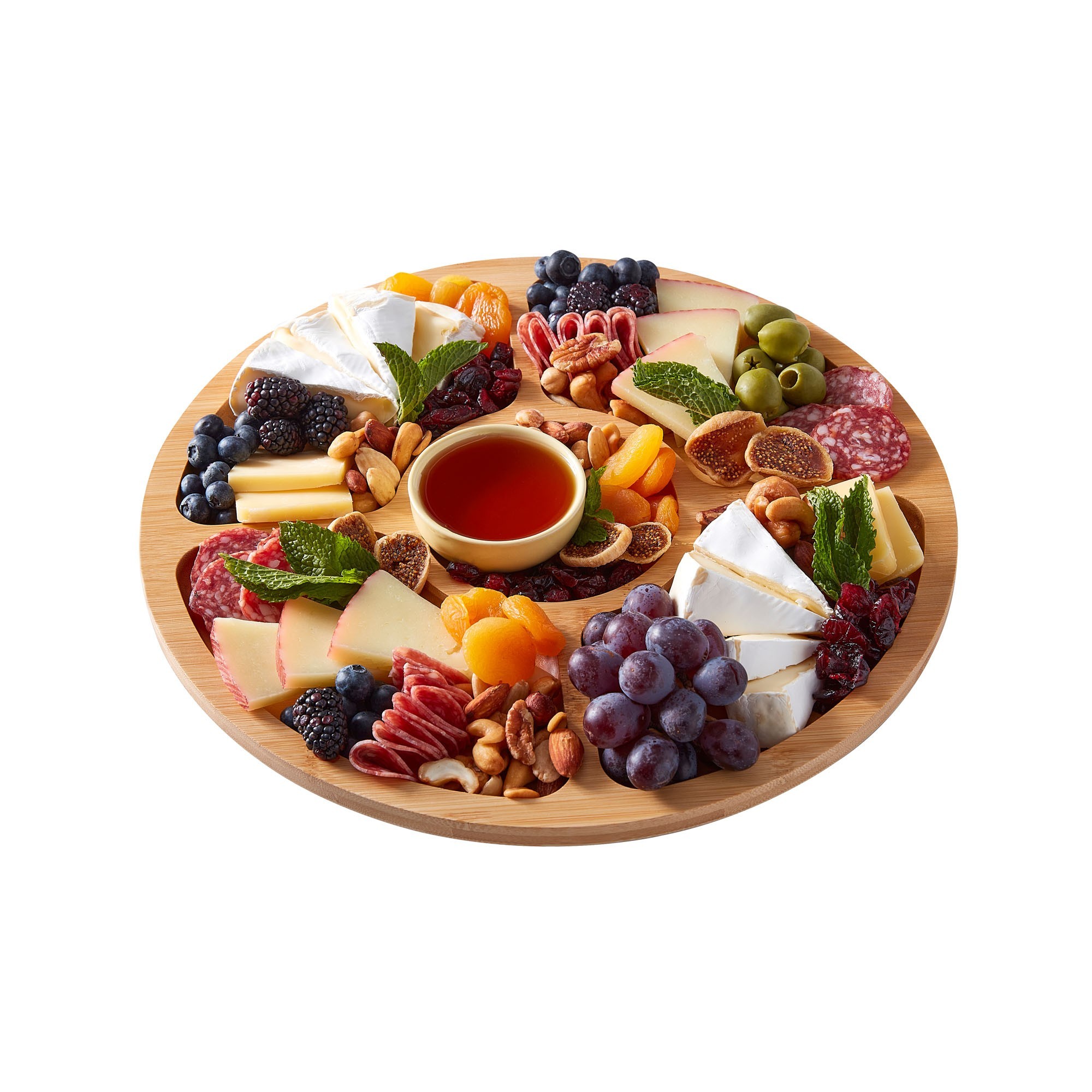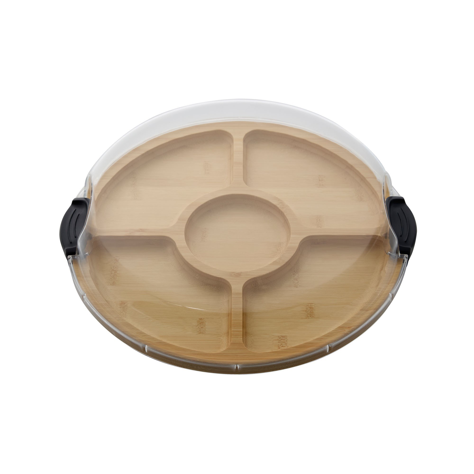 Platou compartimentat Farberware™ Build-a-Board, fabricat din bambus, diametru 35,5 cm, dotat cu capac din plastic.