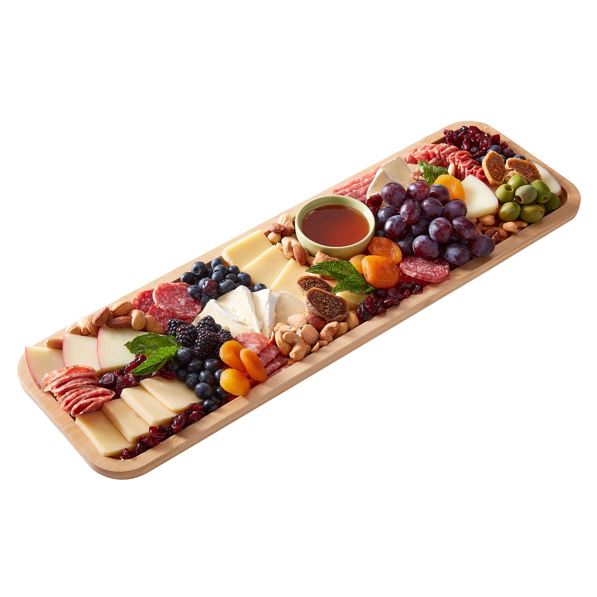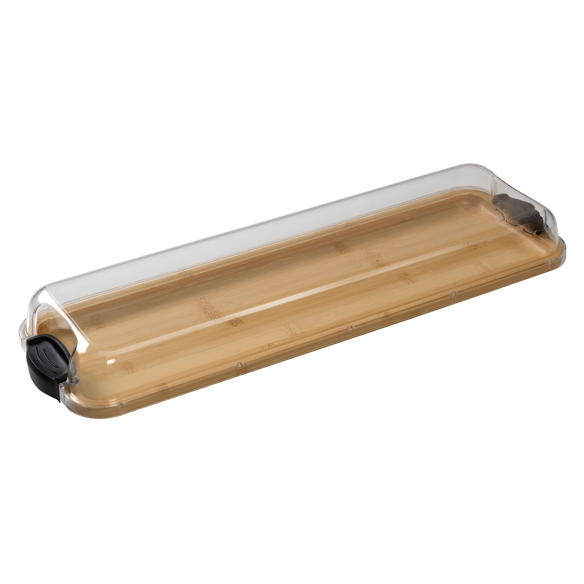 Platou servire aperitive, Farberware™ Build-a-Board, fabricat din bambus, dimensiuni 17 x 56 cm, dotat cu un capac din plastic.