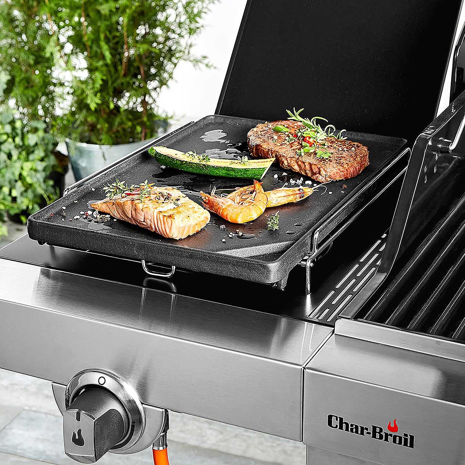 Tava universala din fonta se potriveste celor mai multe gratare pe gaz Char-Broil.