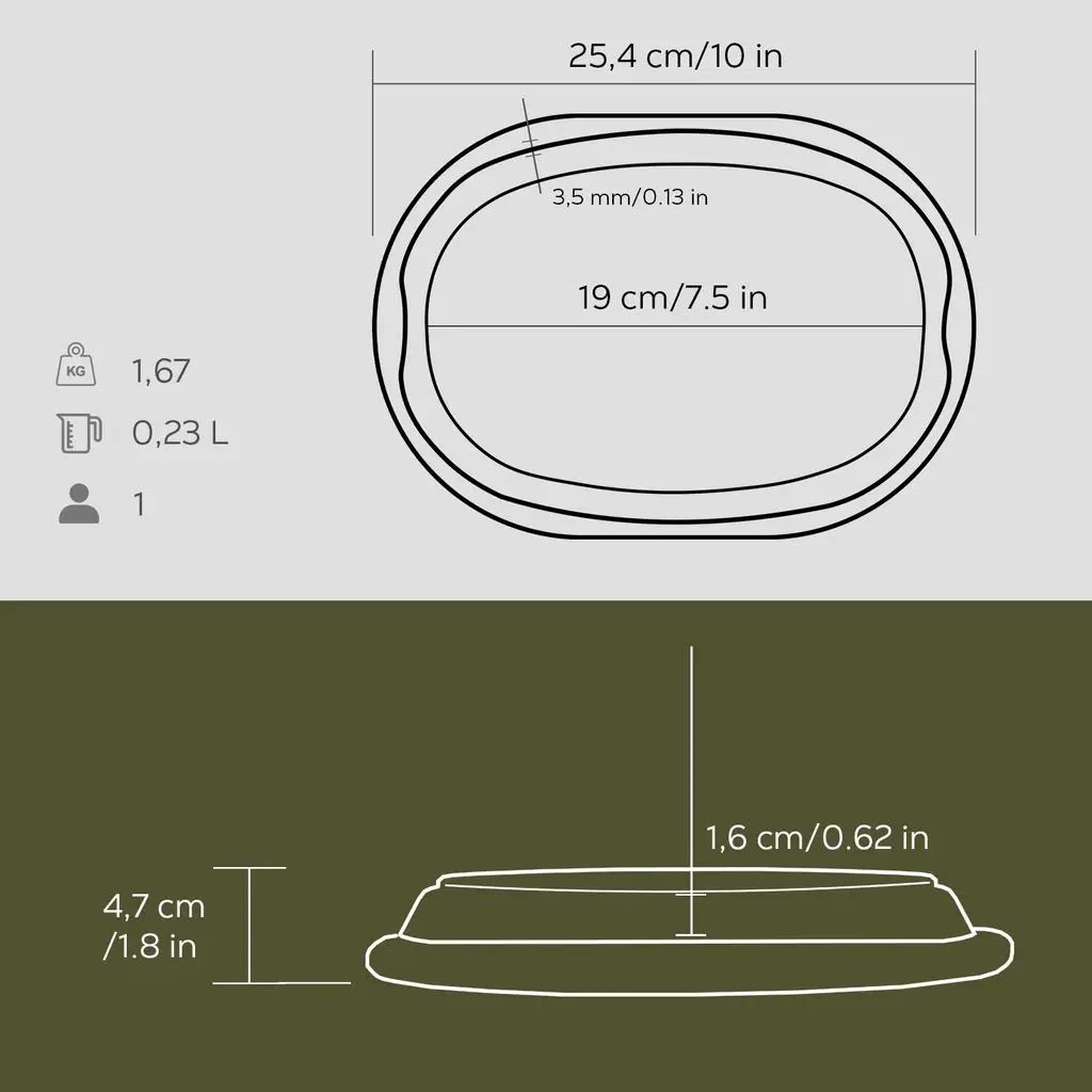 Plita are capacitatea 0,23 l si este potrivita pentru 1 portie.