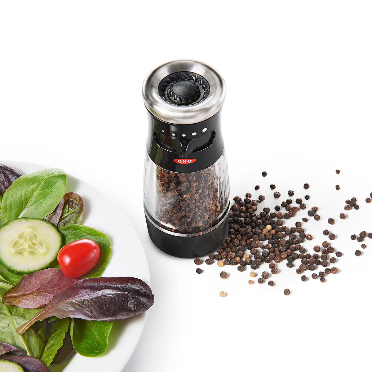 Rasnita de piper eleganta OXO SoftWorks este accesoriul ideal pentru orice bucatarie sau masa. Aceasta rasnita manuala are accente din inox si un corp transparent din acrilic, astfel incat sa stiti exact cand este timpul sa o reumpleti.