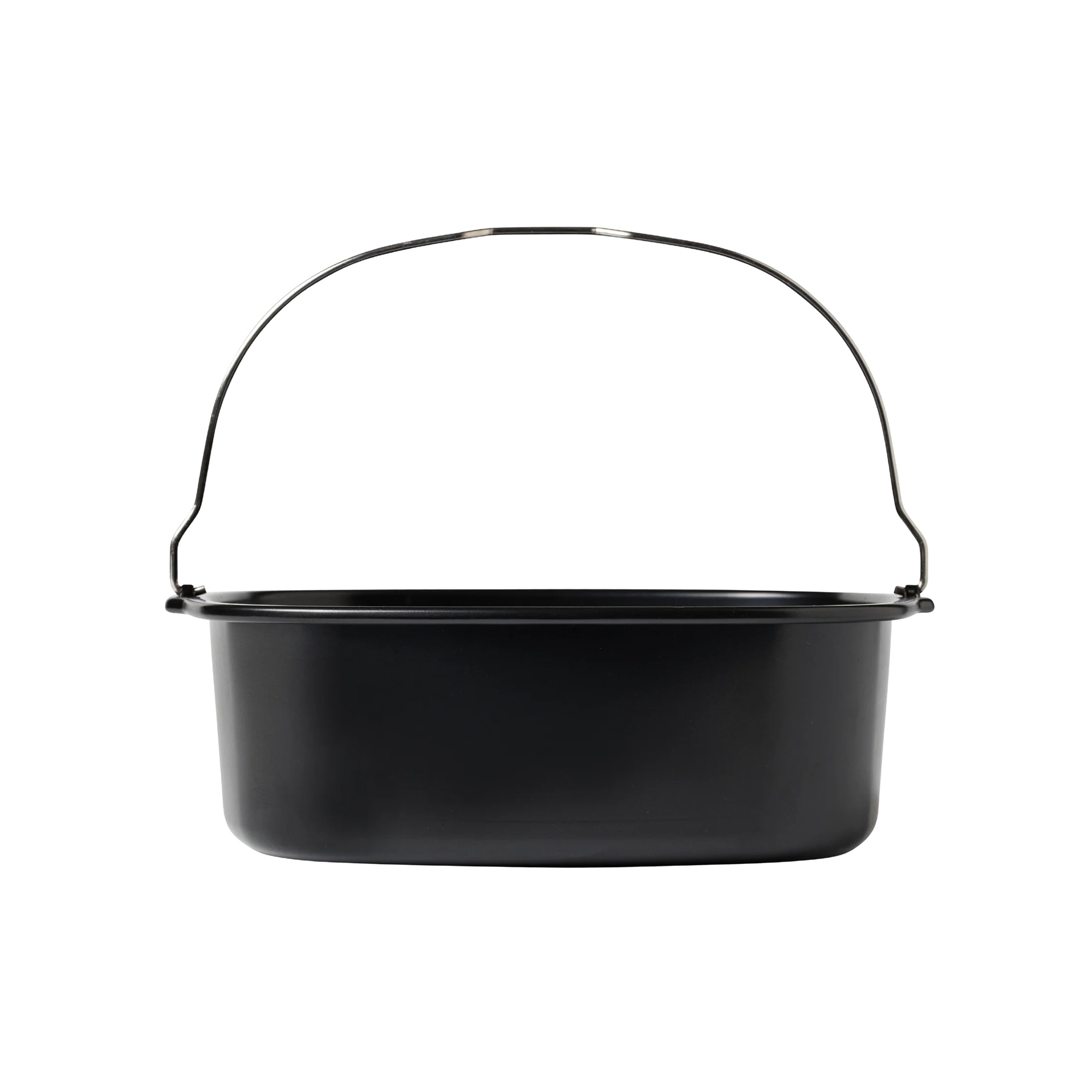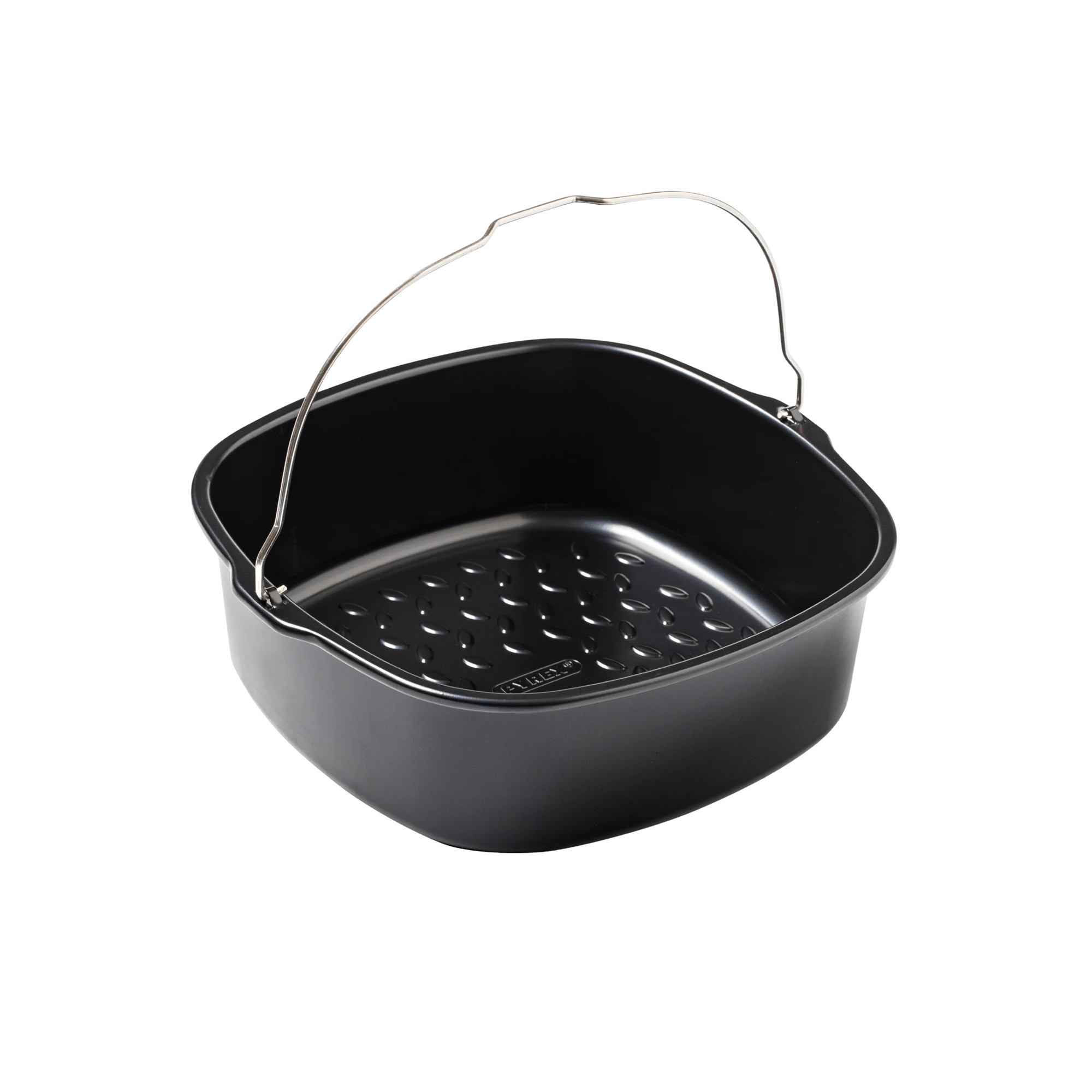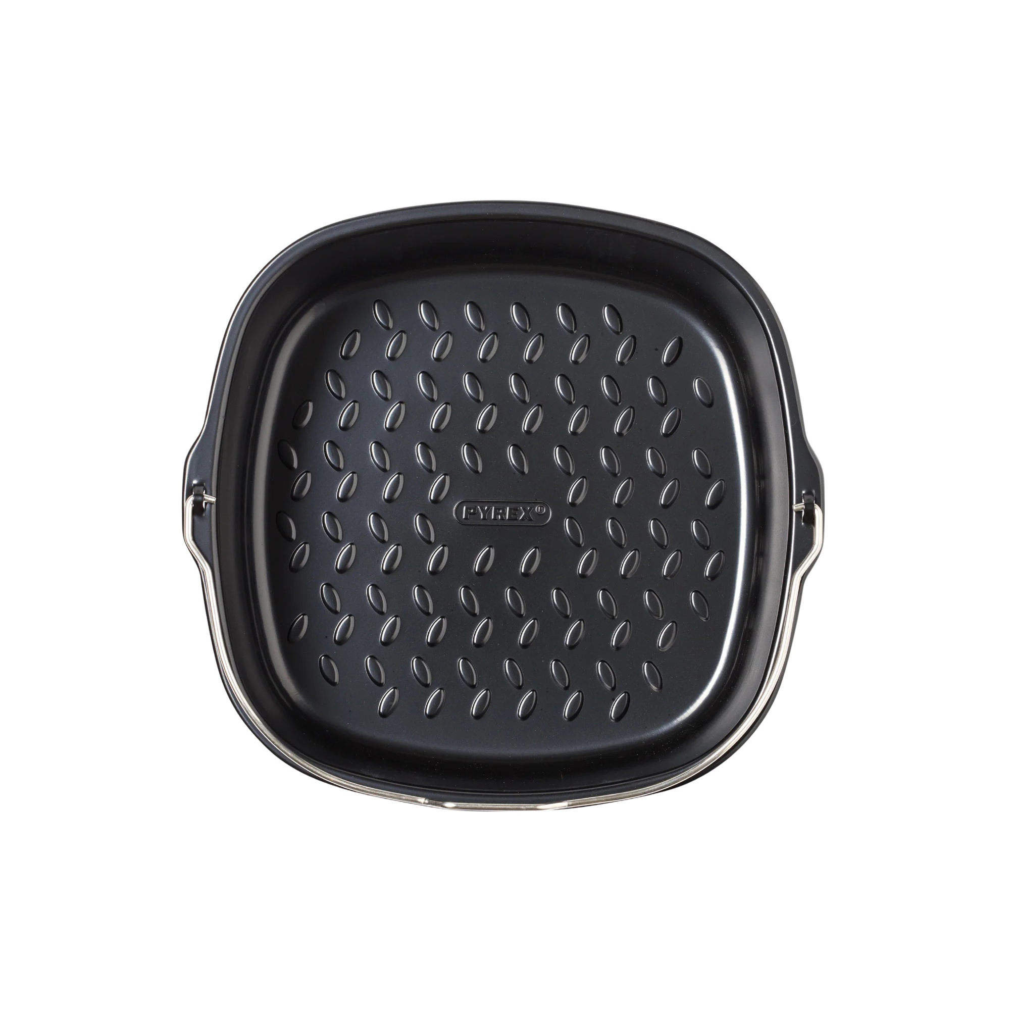 Recipient patrat, potrivit pentru friteuza cu aer cald, cu dimensiunile exterioare 21 x 20 cm, fabricat din otel, cu acoperire antiaderenta, marca Pyrex.