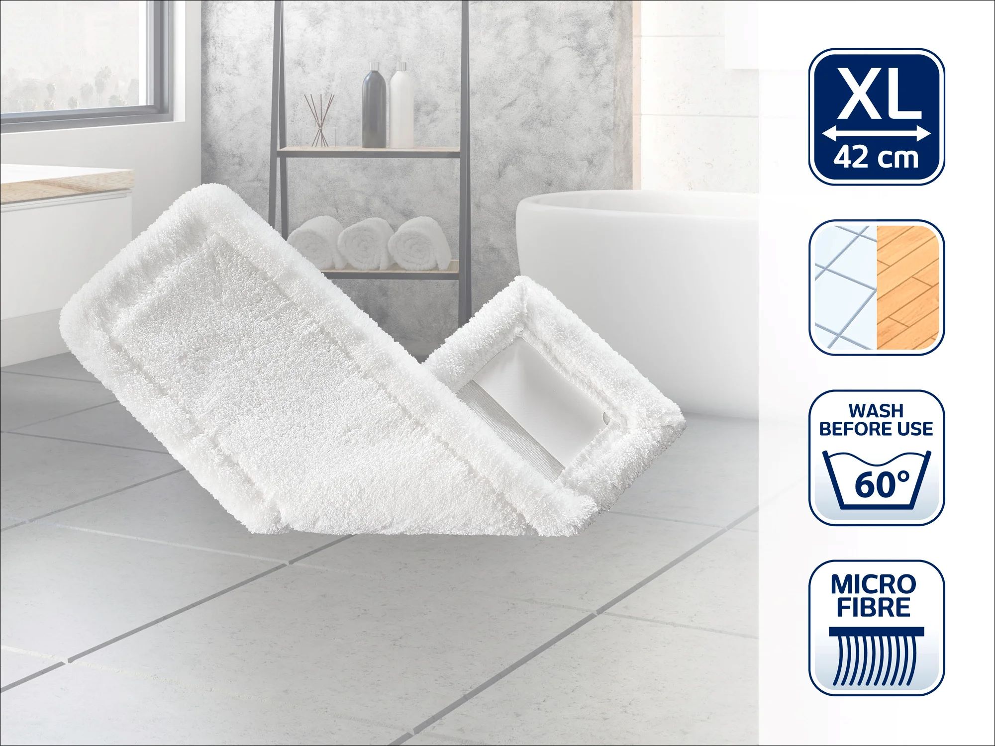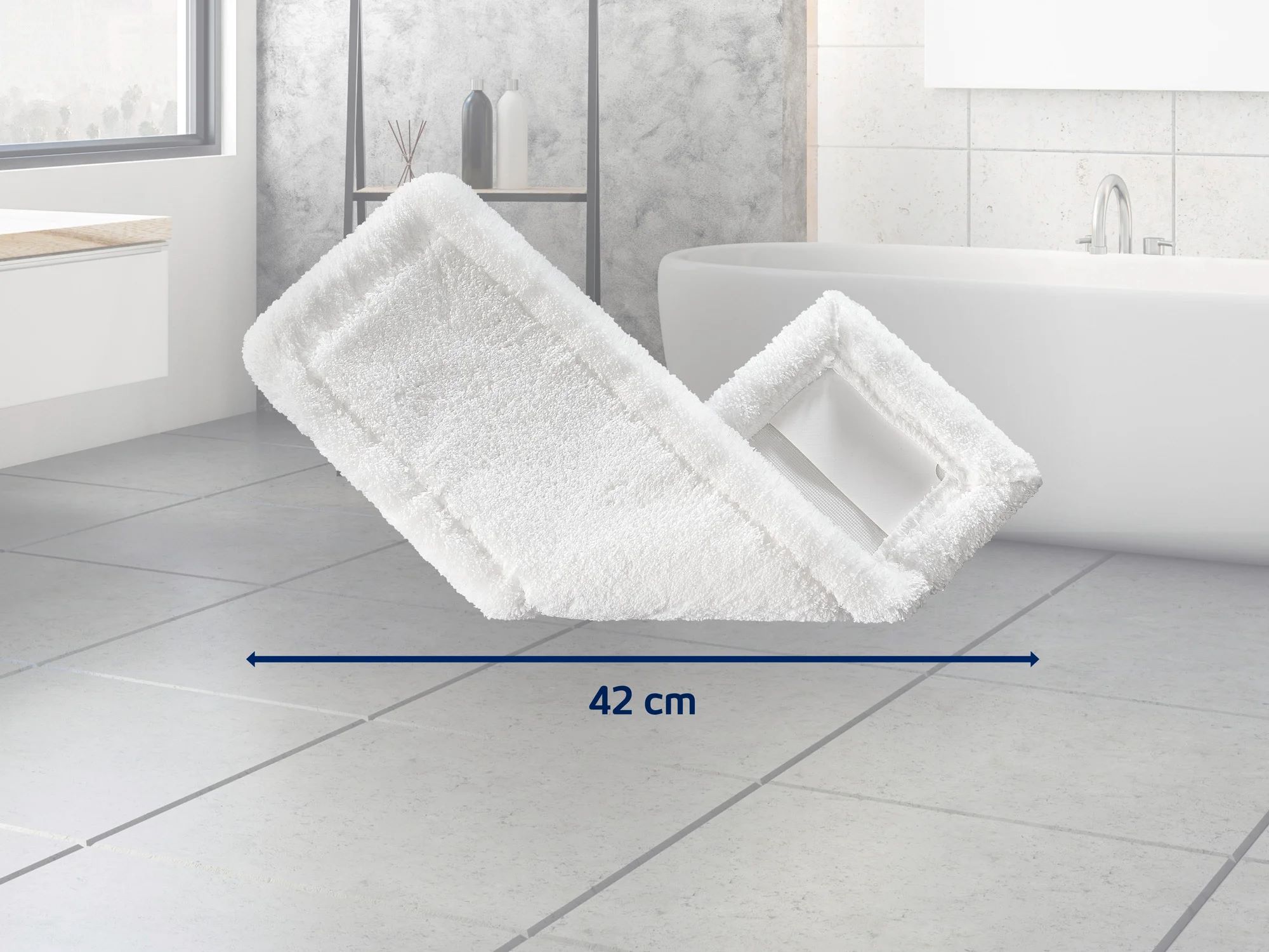 Cu o latime de stergere de 42 cm, este ideala pentru suprafete mari. Laveta din microfibra este fabricata din 100% poliester.