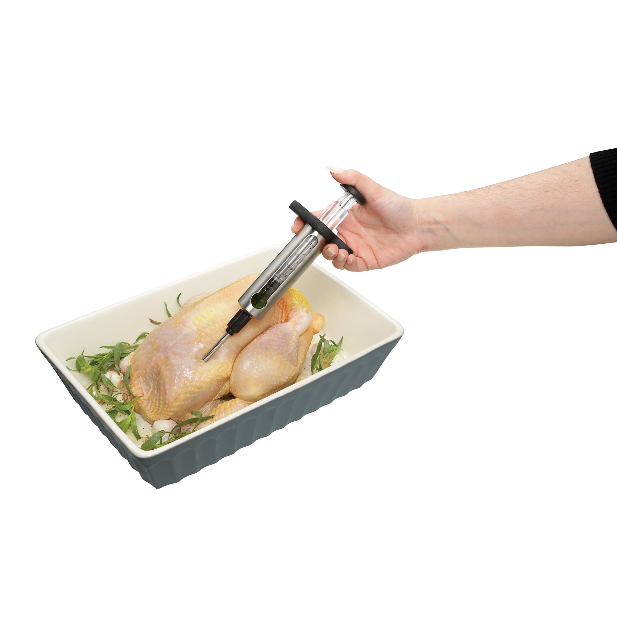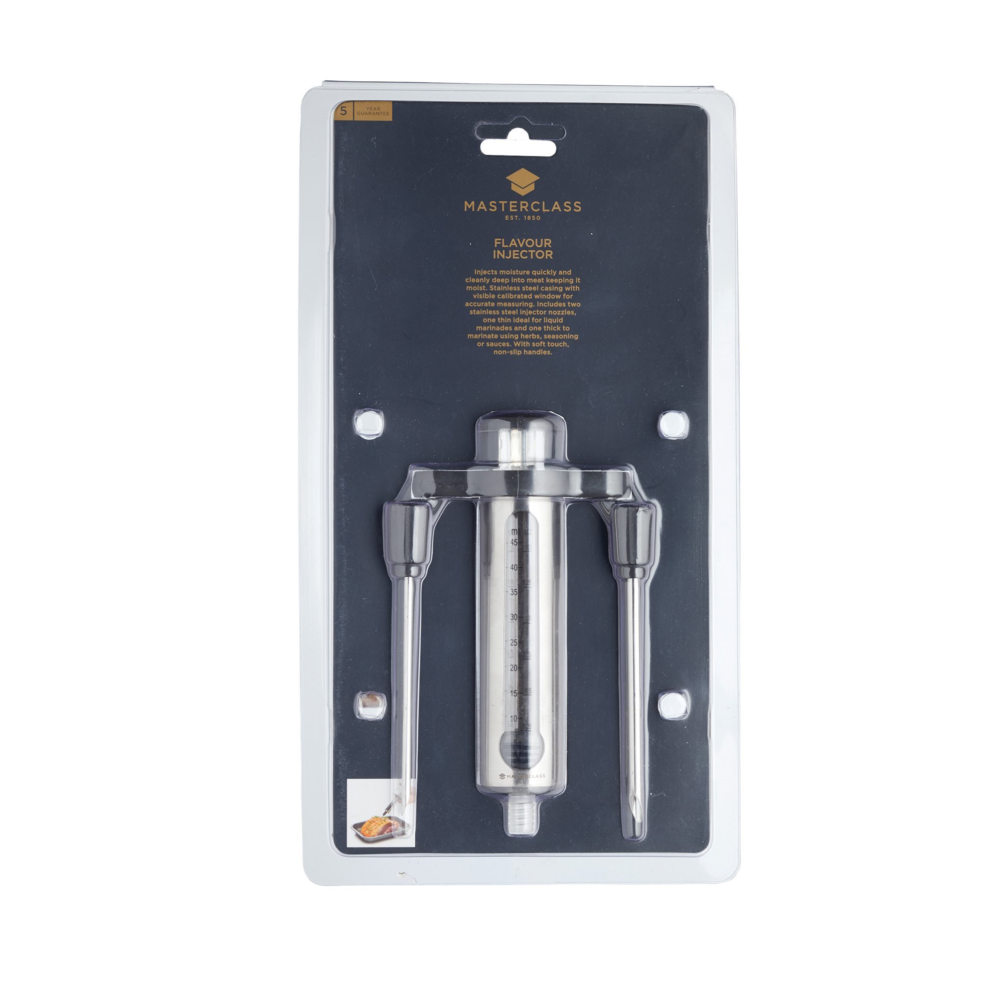 Seringa de bucatarie, marca MasterClass, 45 ml capacitate, din inox si plastic. Este ideala pentru umplerea fripturii cu diverse sosuri, a gogosilor cu gem, etc.