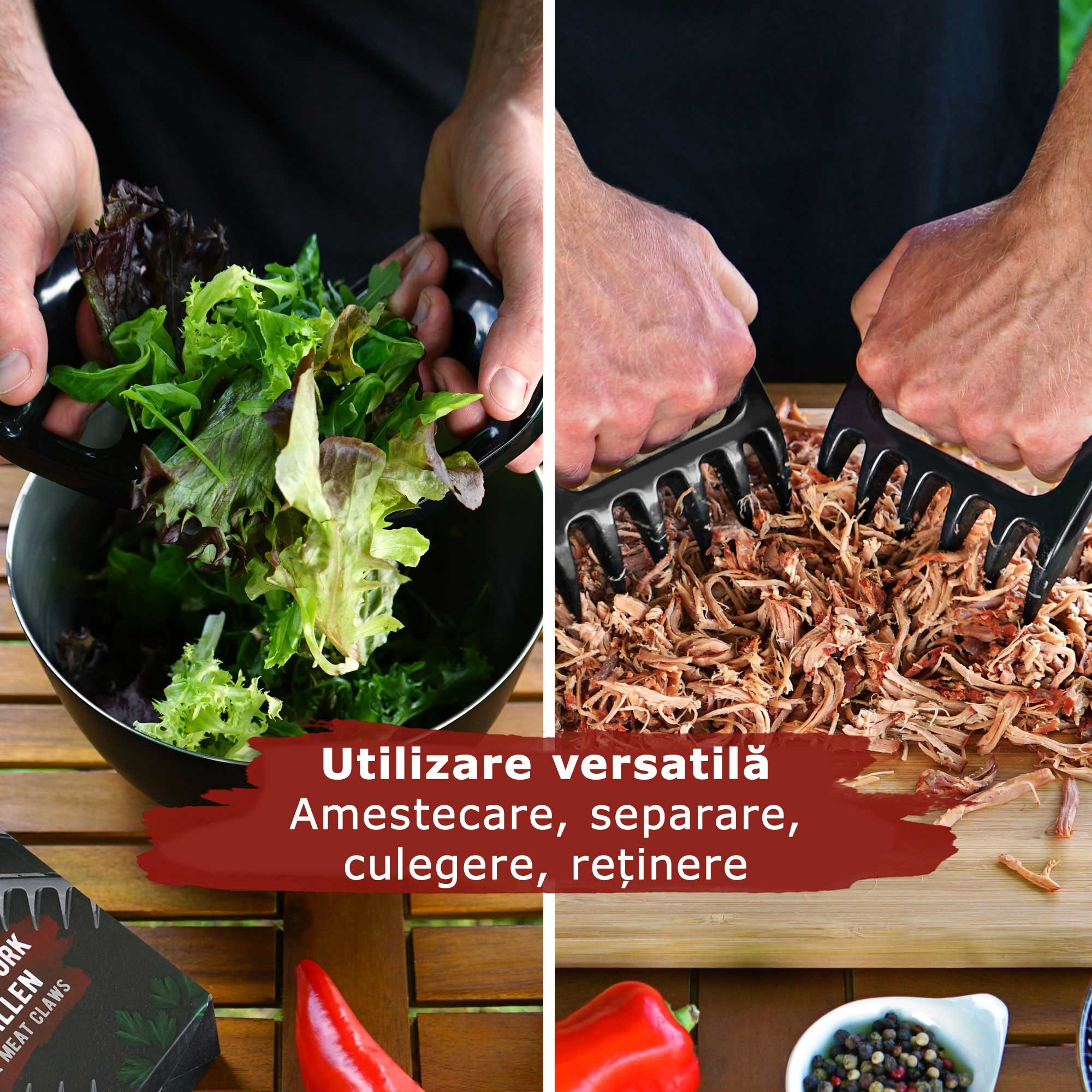 Carnea de porc delicioasa si suculenta este gata si acum trebuie sa fie rupta in bucati. Cine nu a incercat sa faca asta cu furculitele de bucatarie, fara prea mare succes? Tocmai pentru asta exista aceste gheare pentru carne de porc! In cateva secunde, veti obtine carne de porc sfaramata perfect, fara a mai indoi furculitele de bucatarie, deoarece plasticul rezistent la caldura al ghearelor pentru carne de porc, cu ghearele ascutite, este perfect pentru acest scop. Cu un cost initial foarte mic, veti avea un companion fidel pentru carne de porc perfect portionata, timp de multi ani!