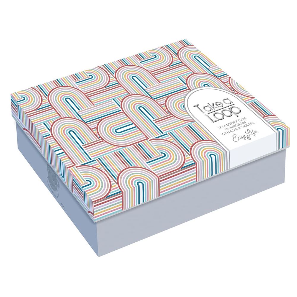 Set 4 cesti pentru espresso "Take a Loop", din portelan, cu farfurie din acacia, capacitate individuala 110 ml, marca Nuova R2S.