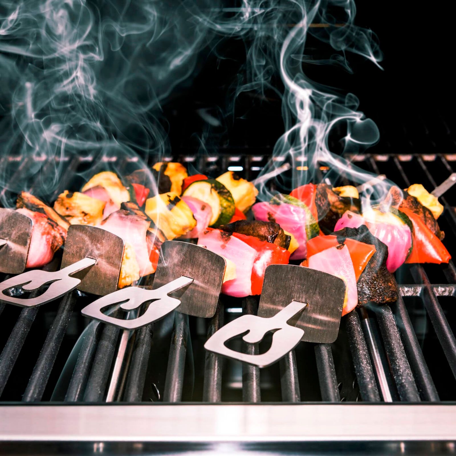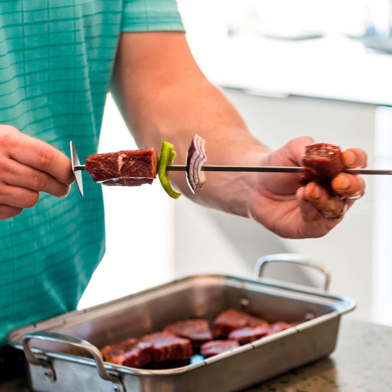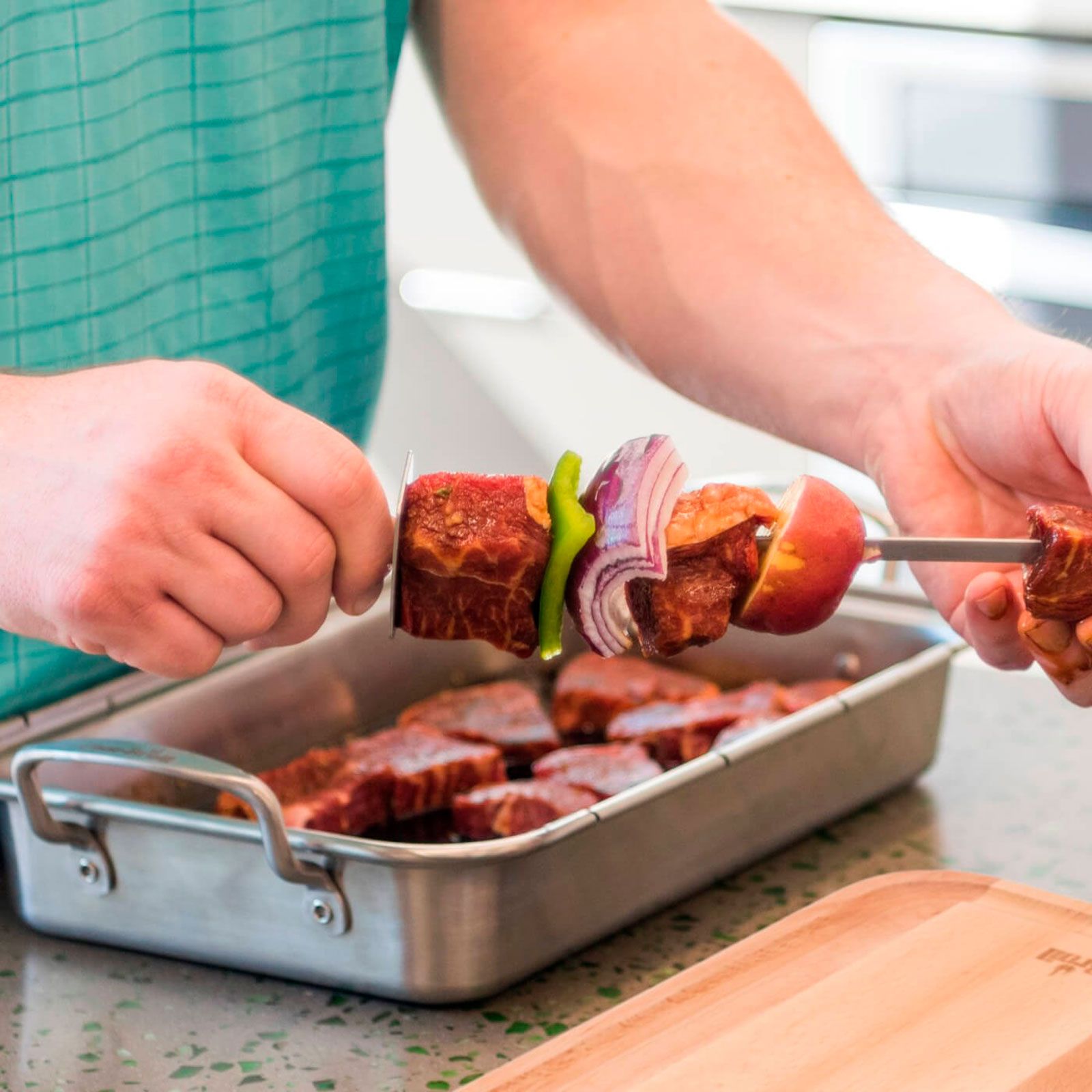 Noul set de tepuse metalice si frigarui Char-Broil va ofera noi posibilitati de pregatire a alimentelor pe gratar. Fie singure, fie in combinatie cu alte accesorii de gratar, tepusele metalice si frigaruile pentru gratar sunt perfecte pentru a pregati mancaruri delicioase. Pur si simplu suprapuneti cateva bucati de legume si de carne si frigaruia este gata. Sistemul integrat de glisare permite scoaterea cu usurinta a alimentelor de pe tepuse. Frigaruile sunt fabricate din otel inoxidabil de inalta calitate si bineinteles pot fi curatate in masina de spalat vase.