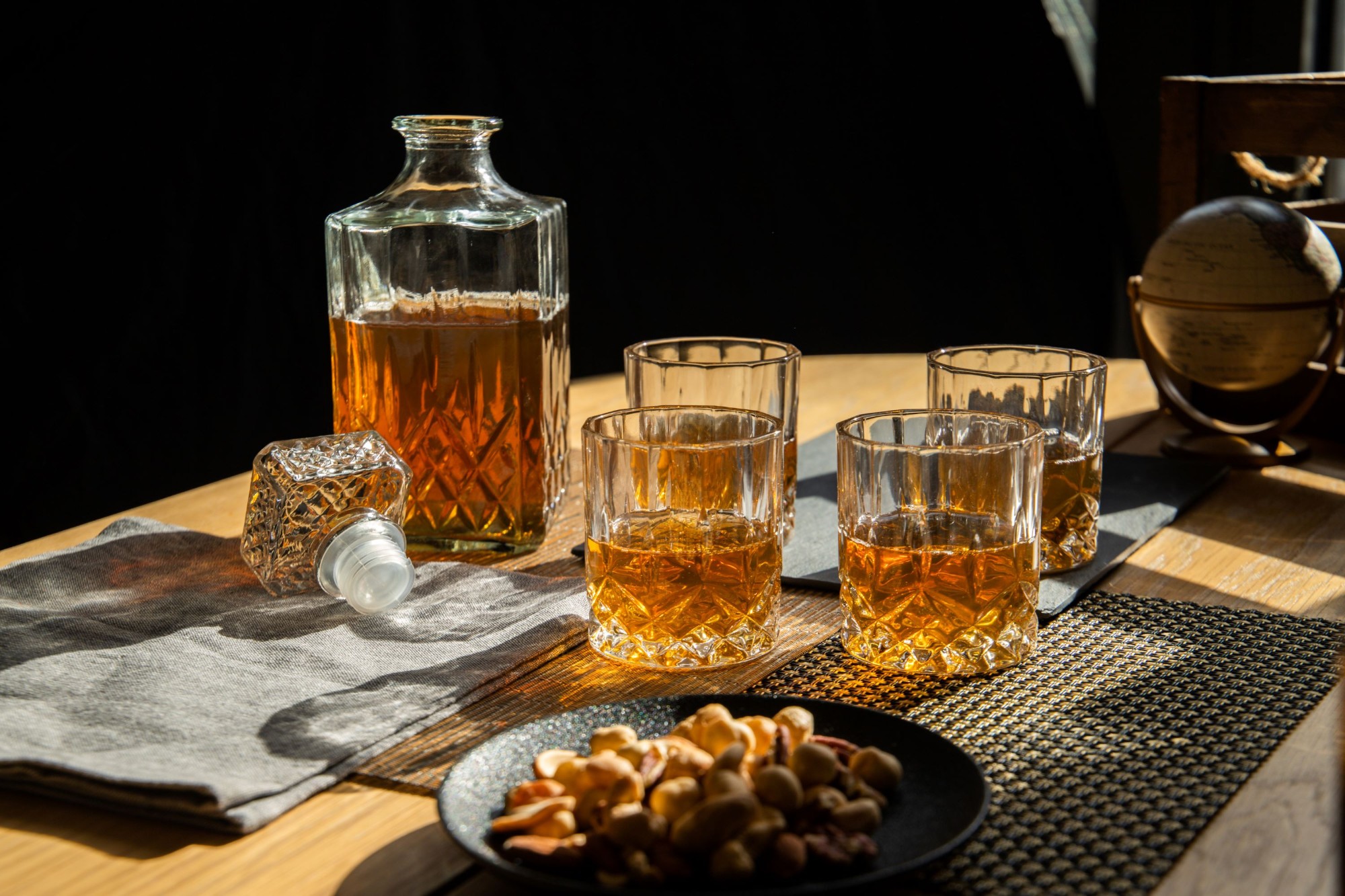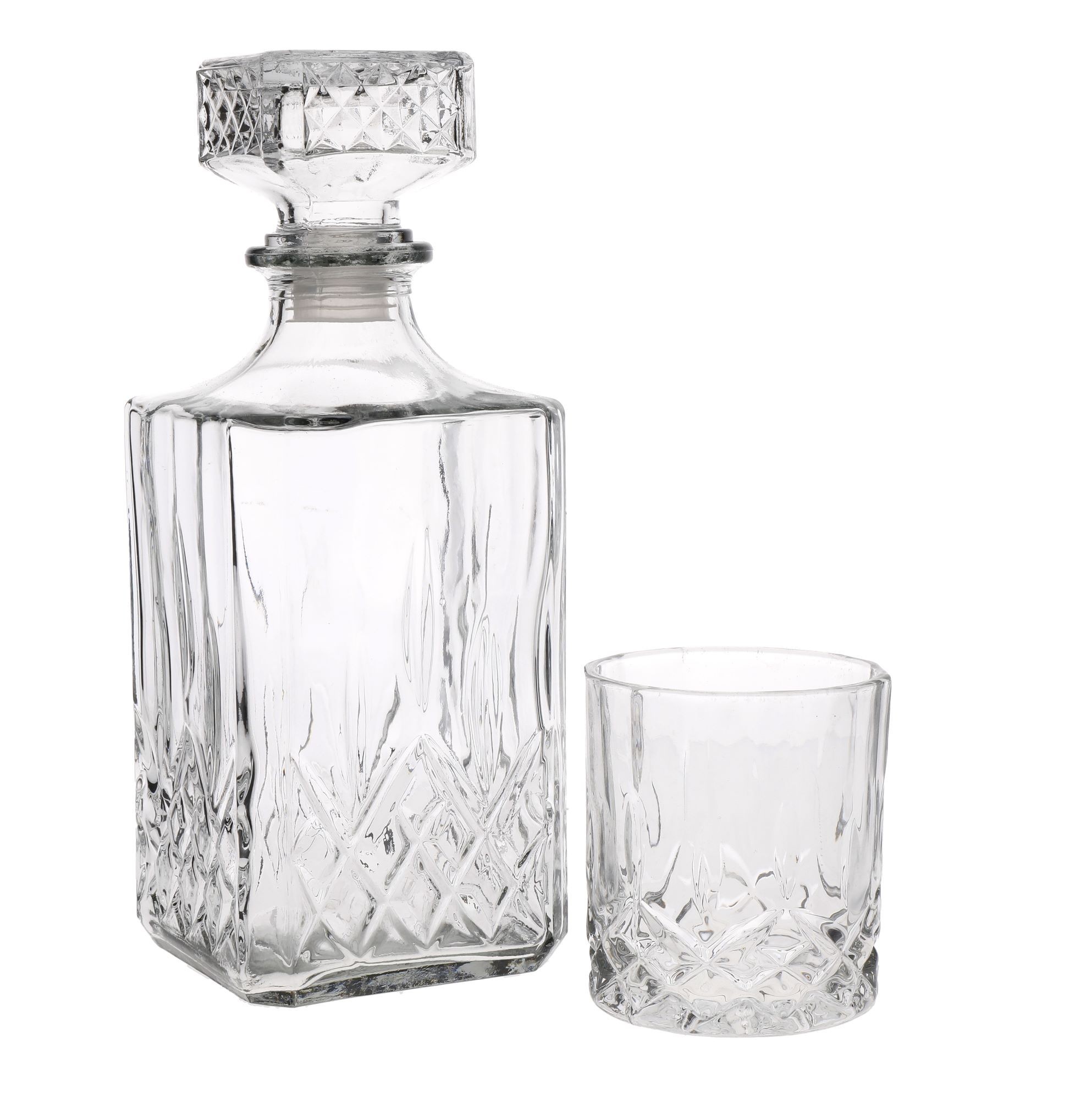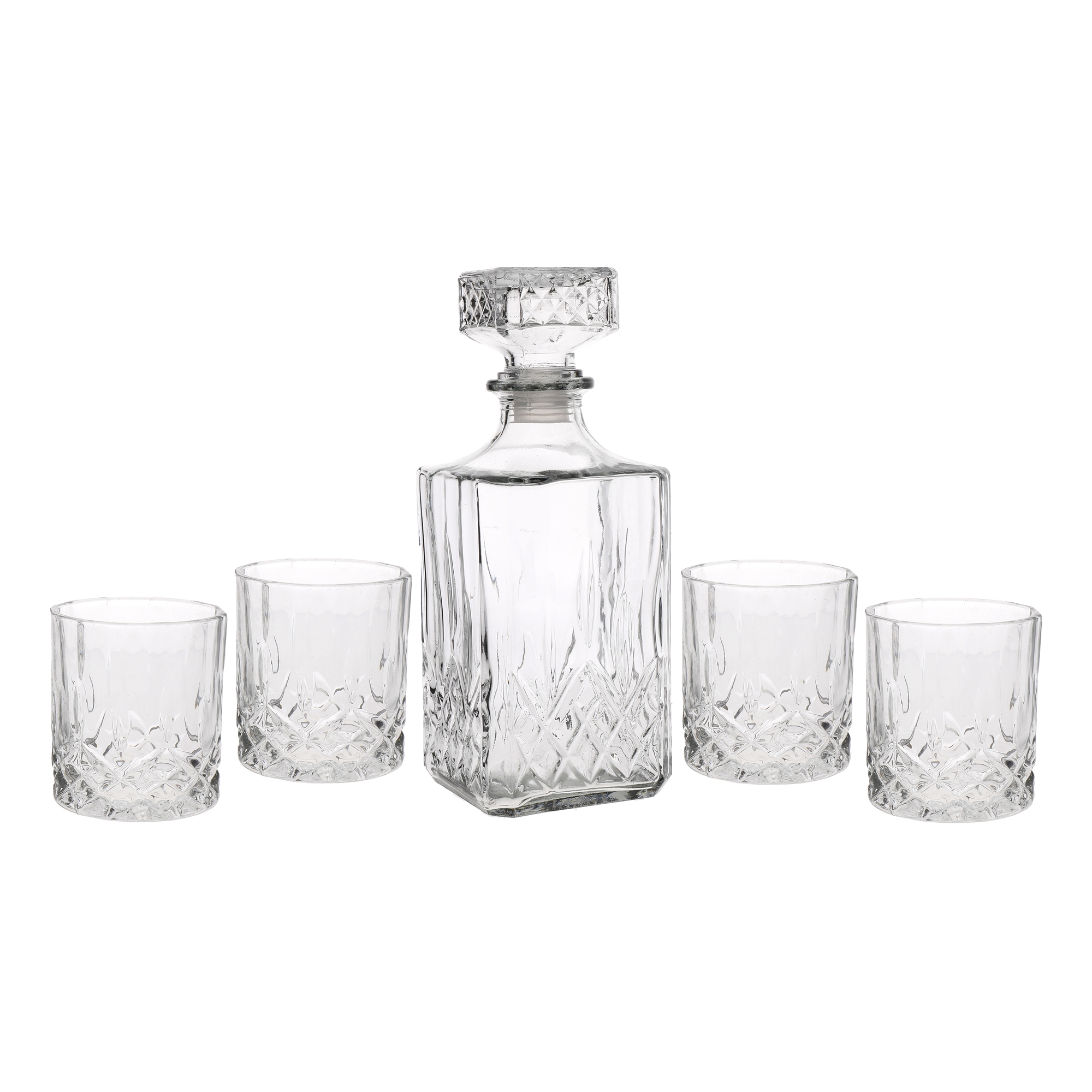 Setul de 5 piese include un decantor din sticla cu o capacitate de 900 ml, ceea ce este mai mult decat suficient pentru a depozita o sticla standard de 700 ml de Scotch. Este dotat cu un capac etans din silicon, pentru a nu se pierde proprietatile bauturii. Sunt incluse in set si 4 pahare cu o capacitate de 200 ml fiecare, fabricate din sticla de inalta calitate, decorate in stil traditional.