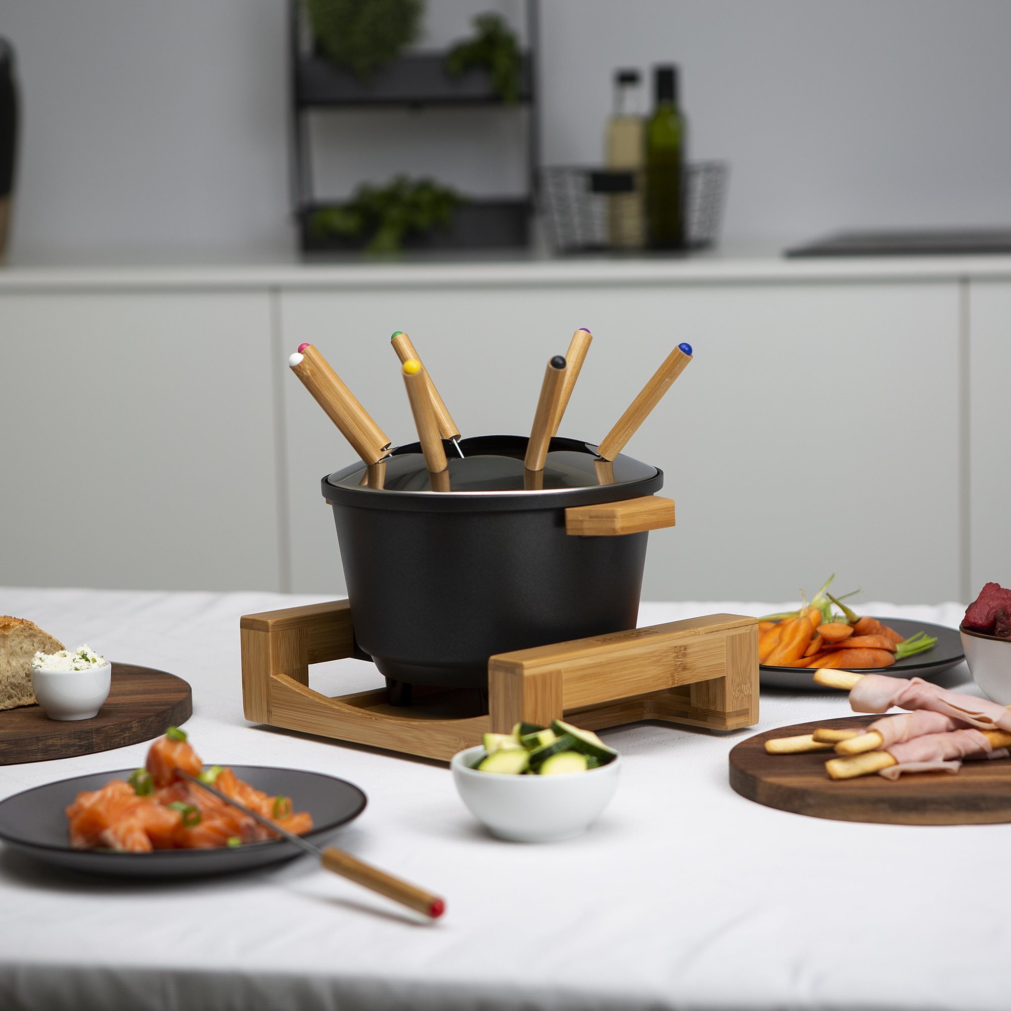 Designul setului fondue electric va atrage cu siguranta toate privirile asupra sa, imbinand elementele din aluminiu turnat cu lemnul de bambus, un material durabil si calitativ. Suportul din lemn de bambus ofera si alte beneficii pe langa cele estetice, ramanand la o temperatura scazuta in timpul utilizarii, pentru ca tu sa poti manevra cu lejeritate setul.