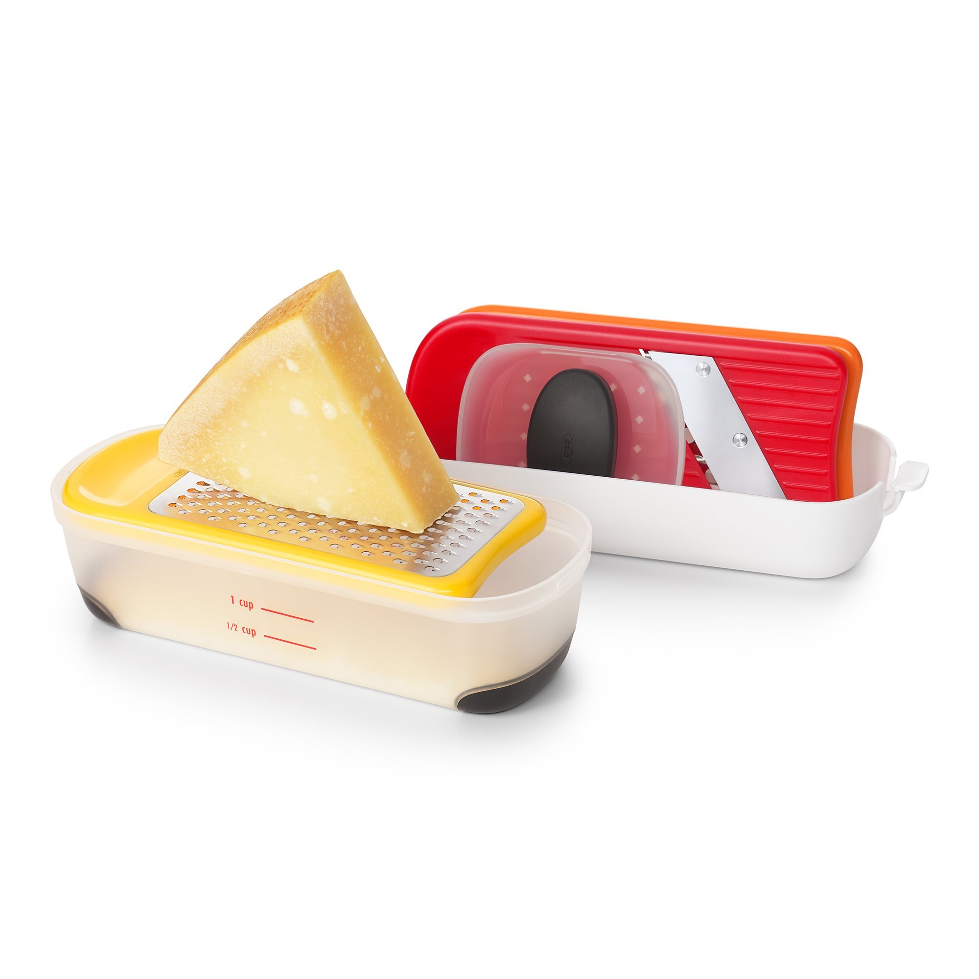 Cele 3 fete interschimbabile pot fi folosite direct deasupra bolurilor, farfuriilor sau chiar atasate capacului transparent al cutiei de depozitare din dotarea setului. Acest capac devine un recipient ce poate fi folosit atat pentru ingredientele razuite sau feliate, cat si pentru a masura pana la 340 gr (1 cup) de ingrediente. Acest recipient are o baza antiderapanta ce ramane nemiscata atunci cand pregatiti alimentele.