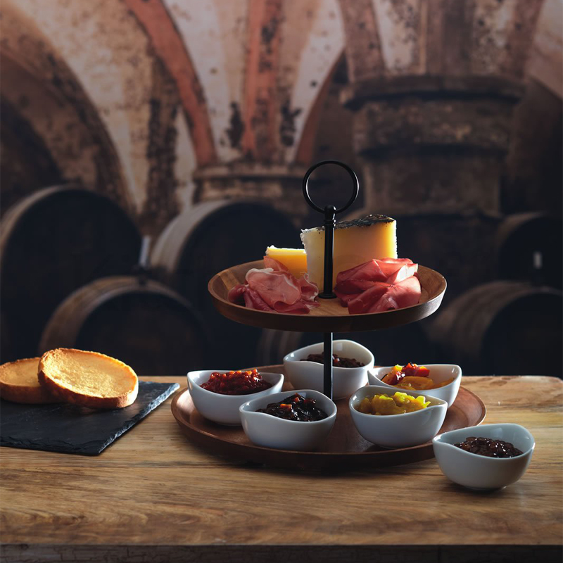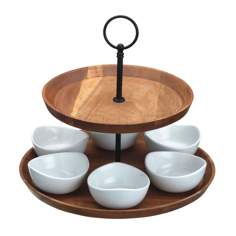 Platoul supraetajat este confectionat din lemn acacia, si este sustinut de un suport metalic cu maner, ce permite o manevrare usoara. Vine la pachet cu 6 boluri din portelan, ce se pot folosi si la cuptorul cu microunde.