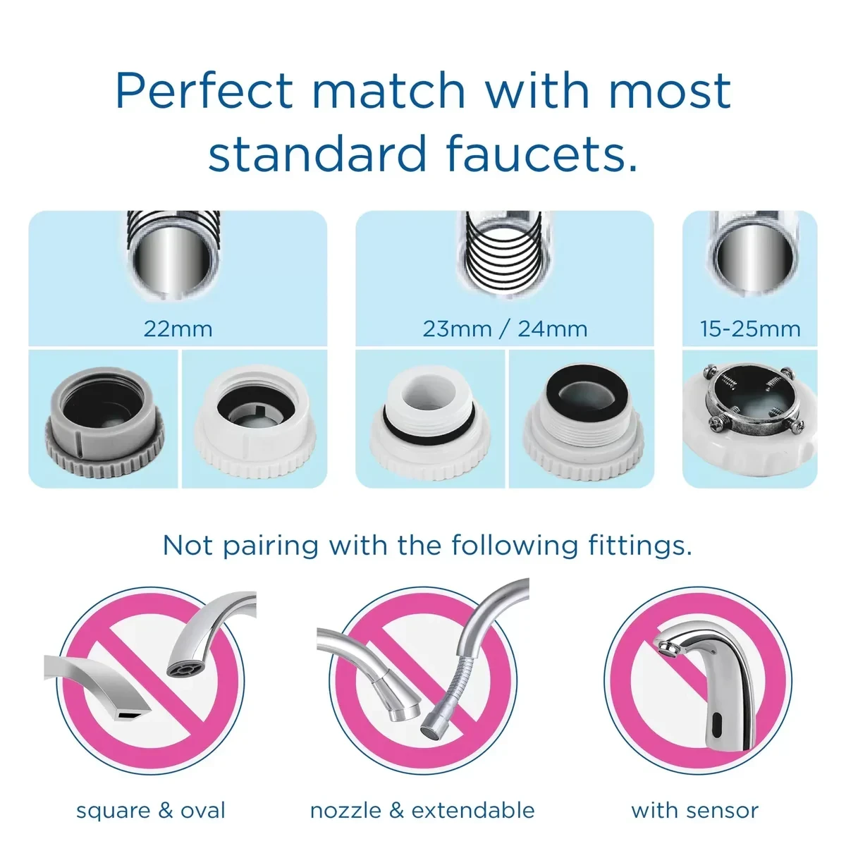 Tipuri de robinete compatibile (5 adaptoare incluse)  Robinete necompatibile (mai mici de 15 mm, rotunde, extensibile, patrate)***