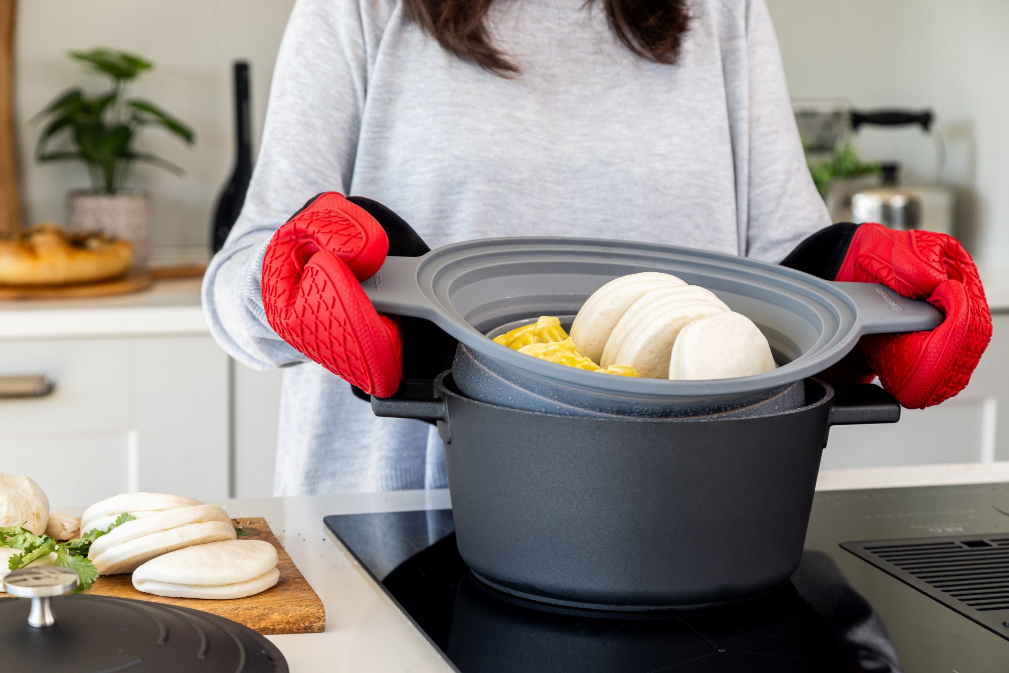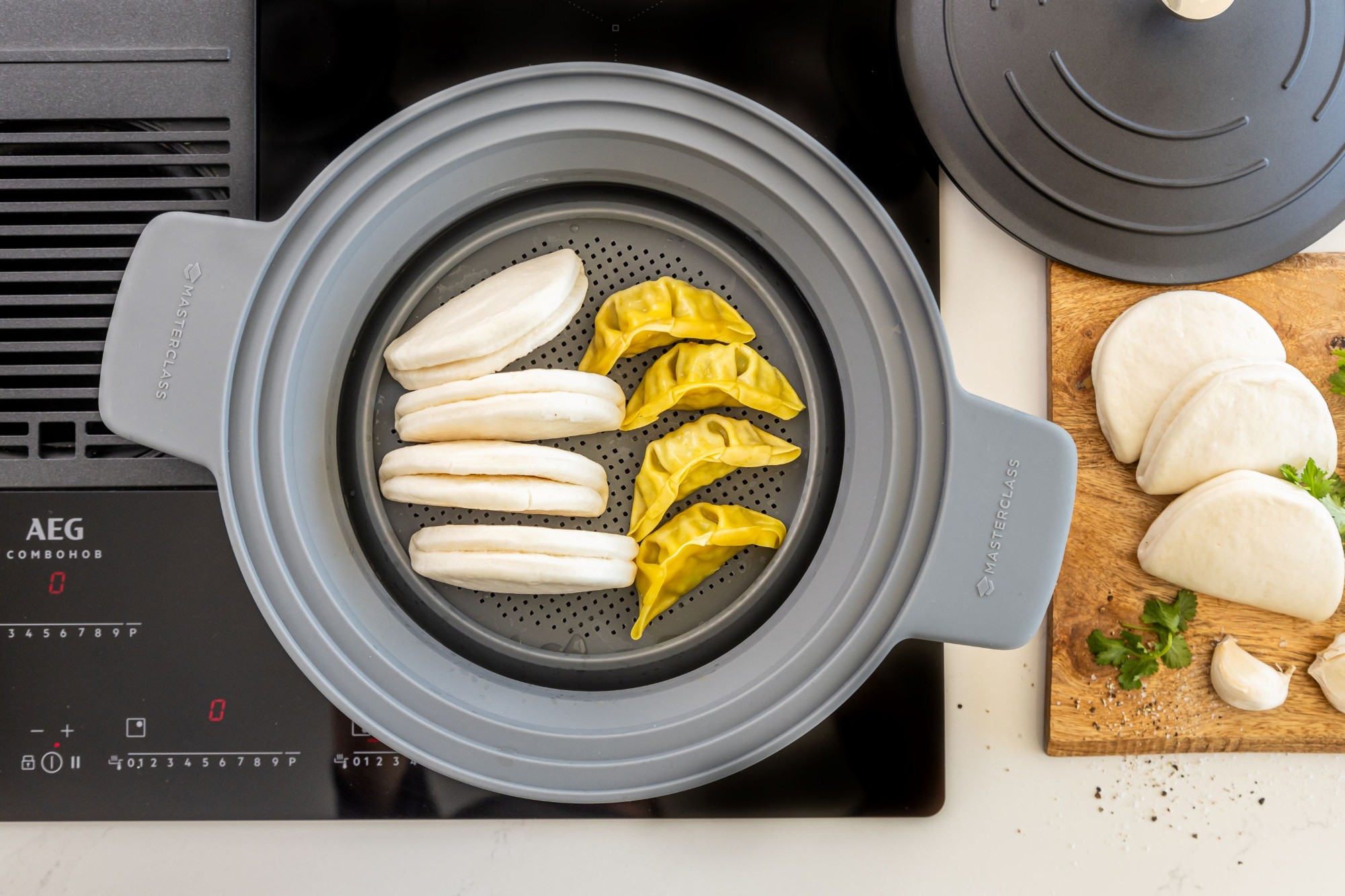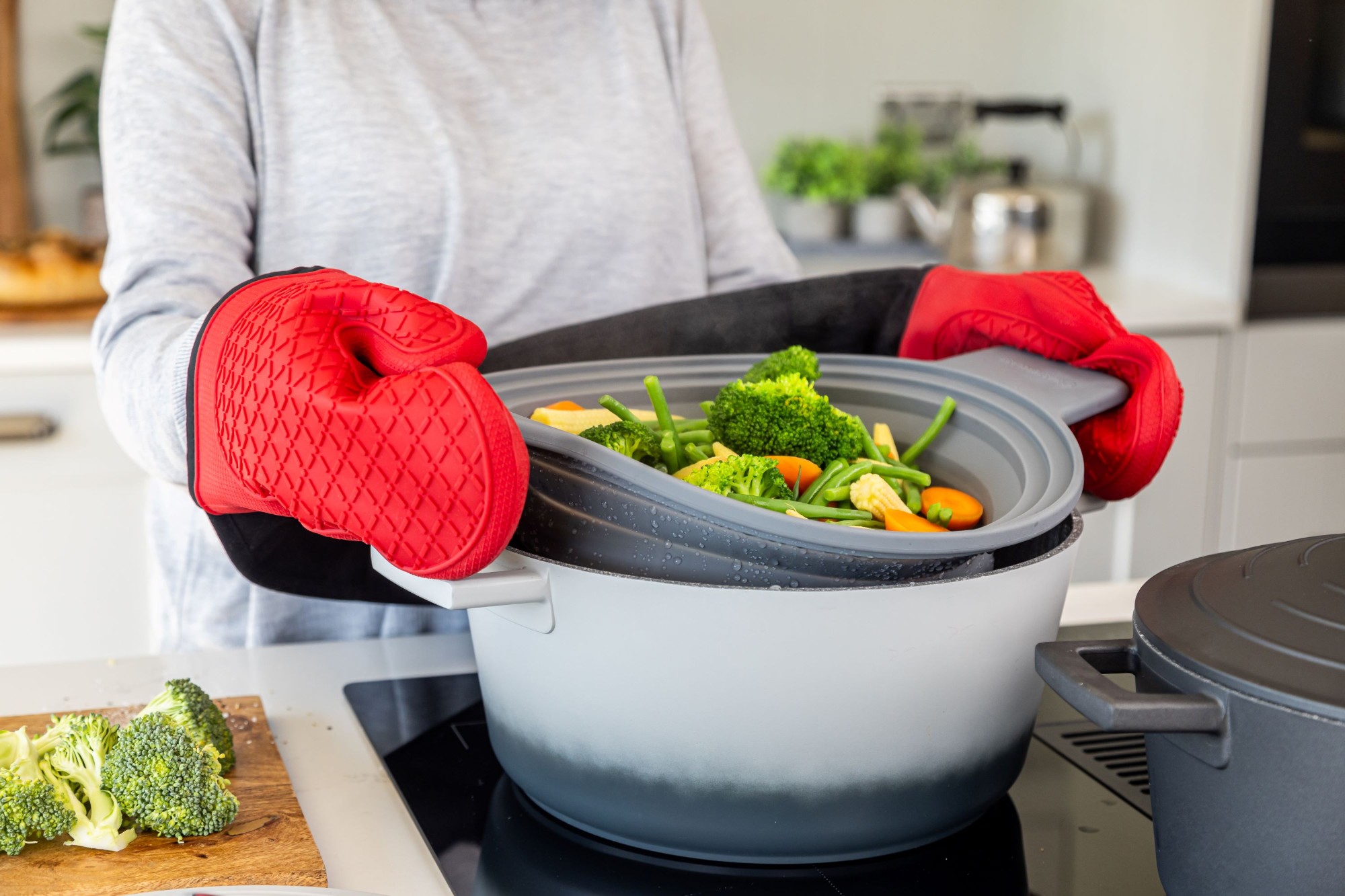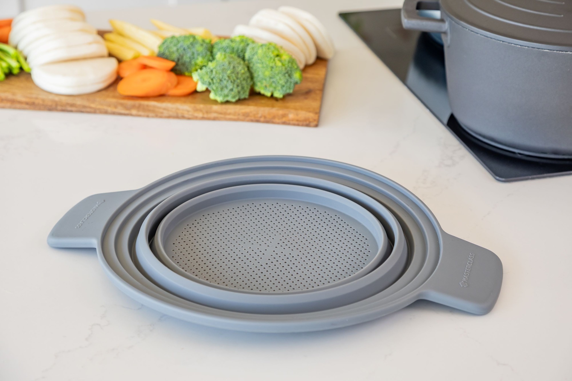 Strecuratoare si cos de gatit la abur 2 in 1, fabricata din silicon, marca MasterClass, cu dimensiunile 39 x 29 cm.