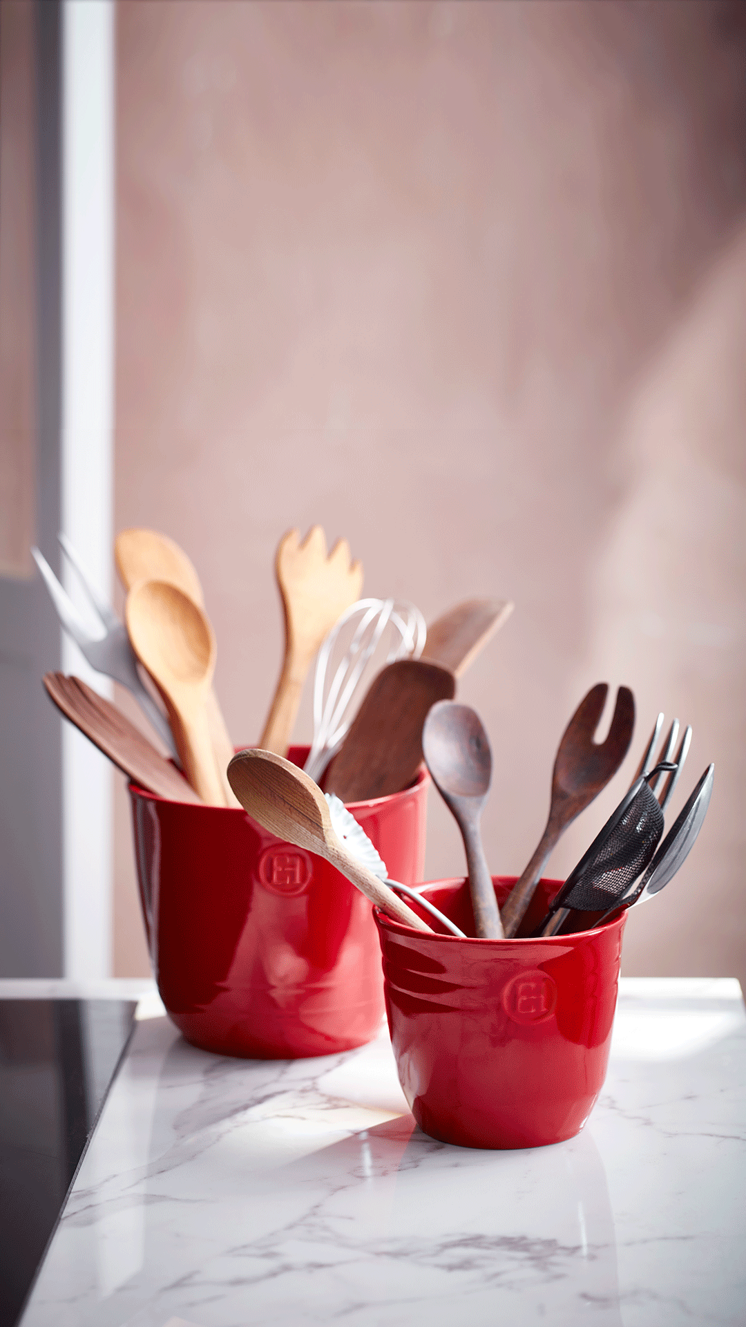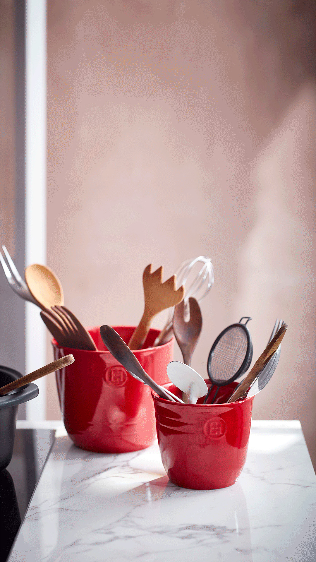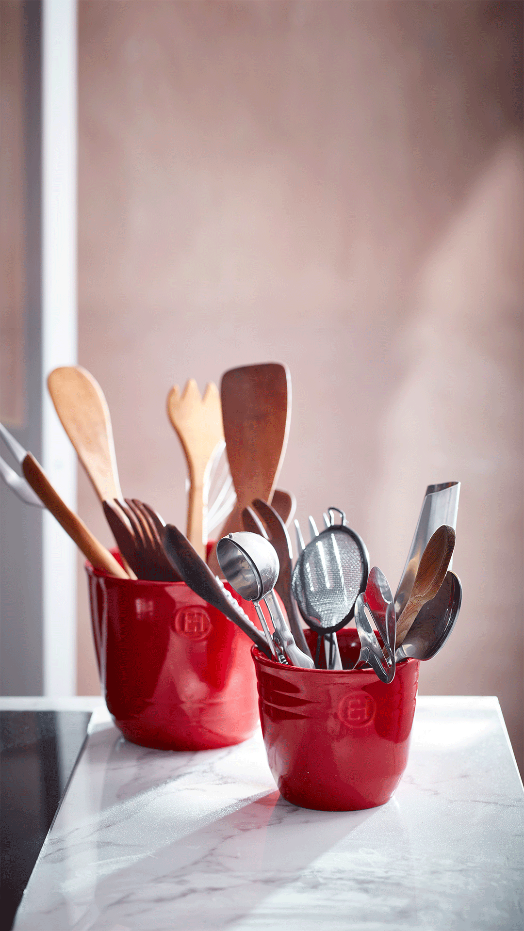 Adaugati o nota de eleganta bucatariei, pastrand in acelasi timp ustensilele de bucatarie intr-un mod organizat, cu noul suport de ustensile de la Emile Henry. Combinand durabilitatea cu estetica, acesta serveste atat ca element esential in bucatarie, cat si ca accesoriu decorativ pentru blat, fiind practic si atragator, chiar si intr-o bucatarie decorata traditional.