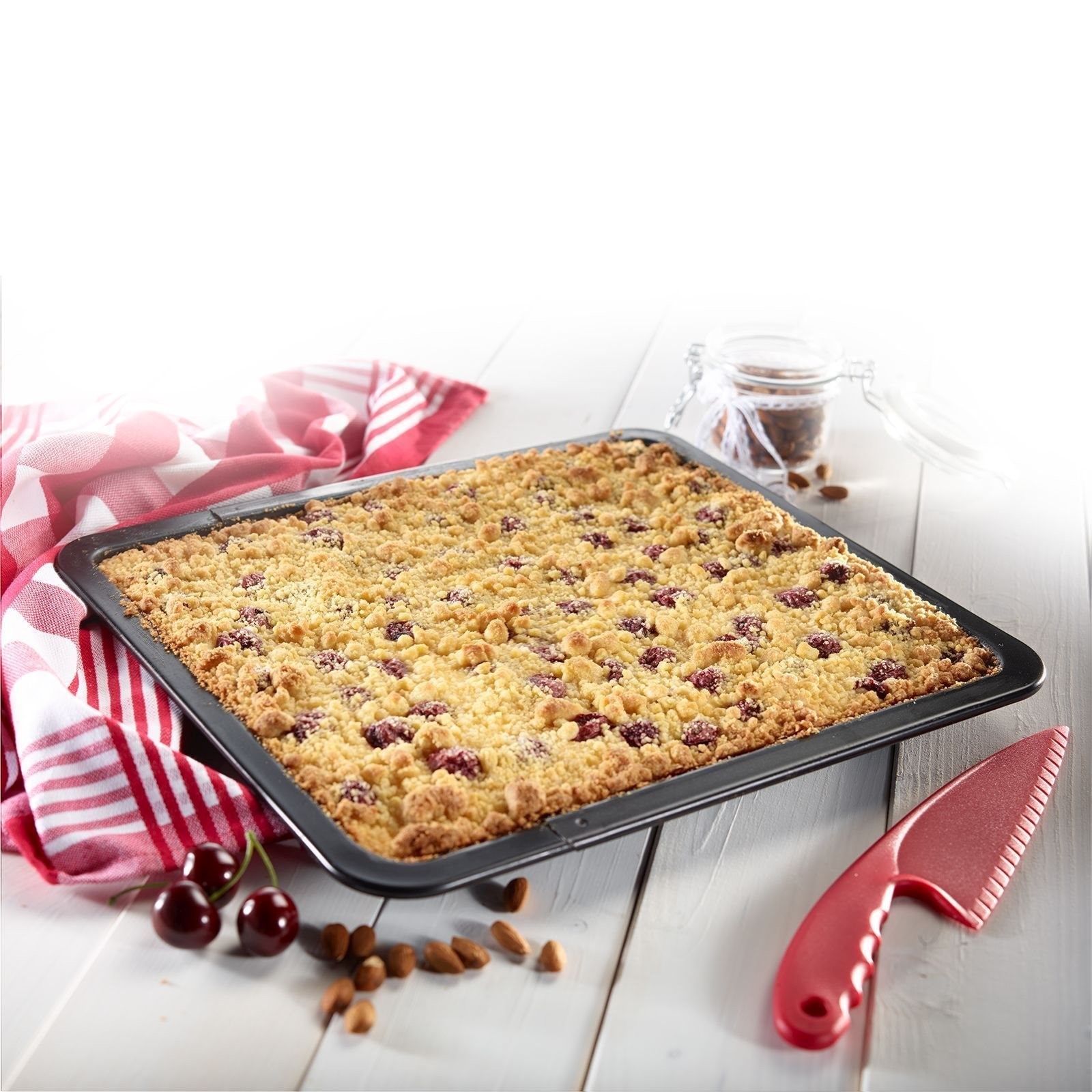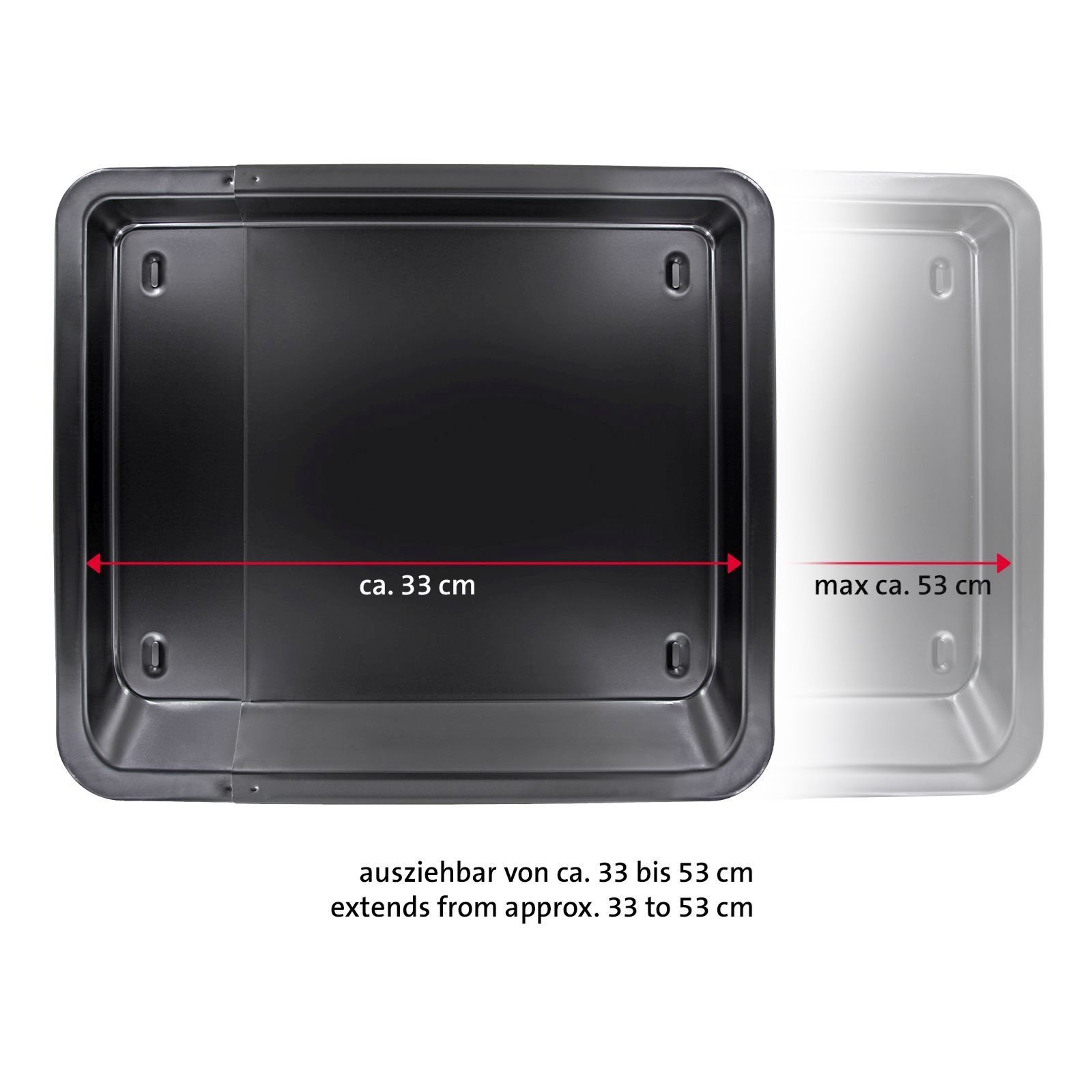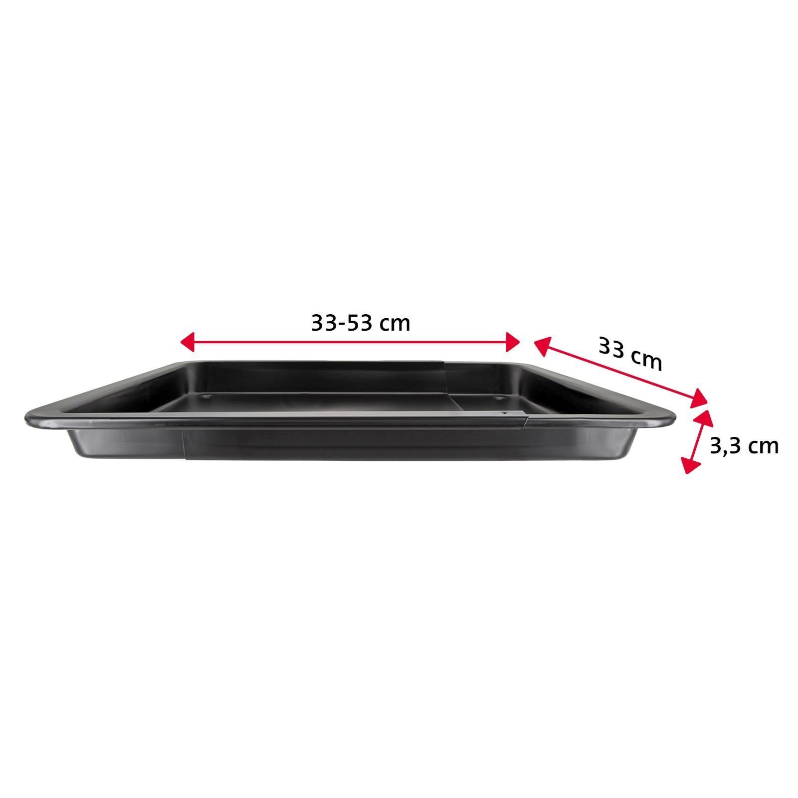 Aceasta tava extensibila, fabricata din otel, marca Westmark, este ideala pentru prepararea prajiturilor, a biscuitilor si in general, pentru coacerea alimentelor. Are dimensiunile 33 x 33 cm si o inaltime de 3 cm. Este rezistenta in cuptor pana la 250°C.