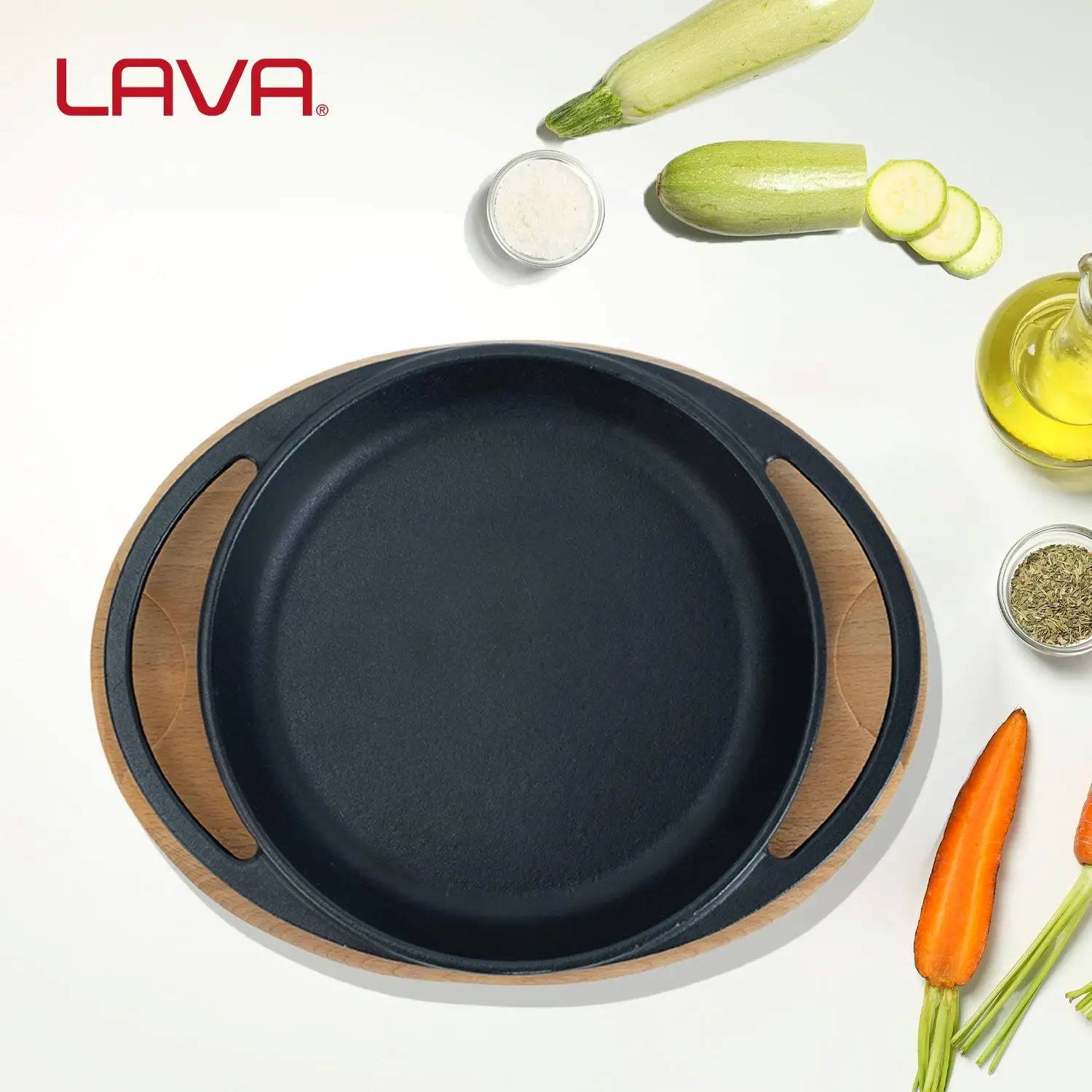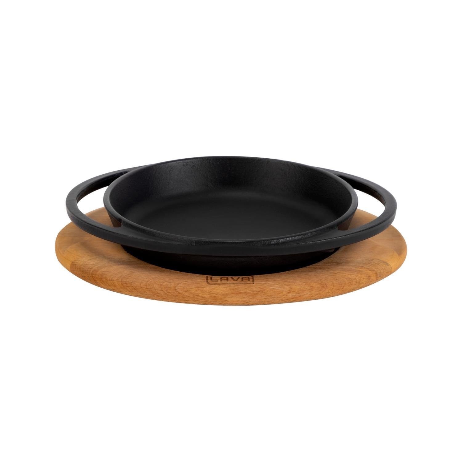 Tava, marca Lava, fabricata din fonta, cu suport din lemn.