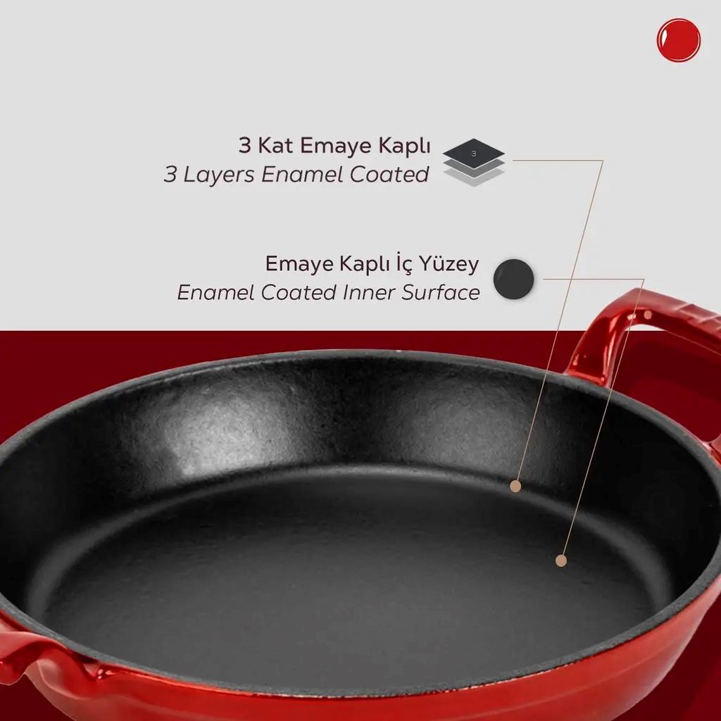 Peretii vasului au o grosime de 3 mm, iar in interior prezinta un strat de email negru ce faciliteaza crearea unei suprafete antiadezive atunci cand se gateste folosind grasimi.
