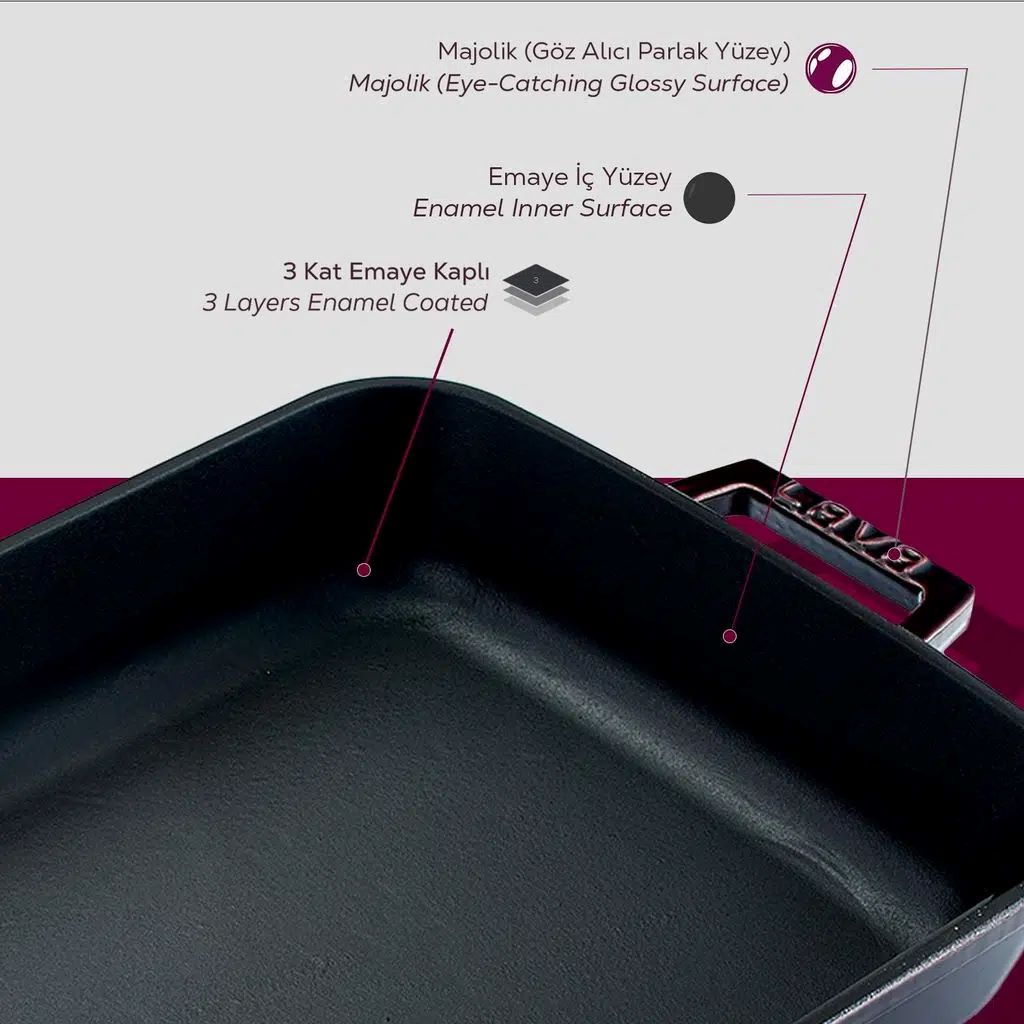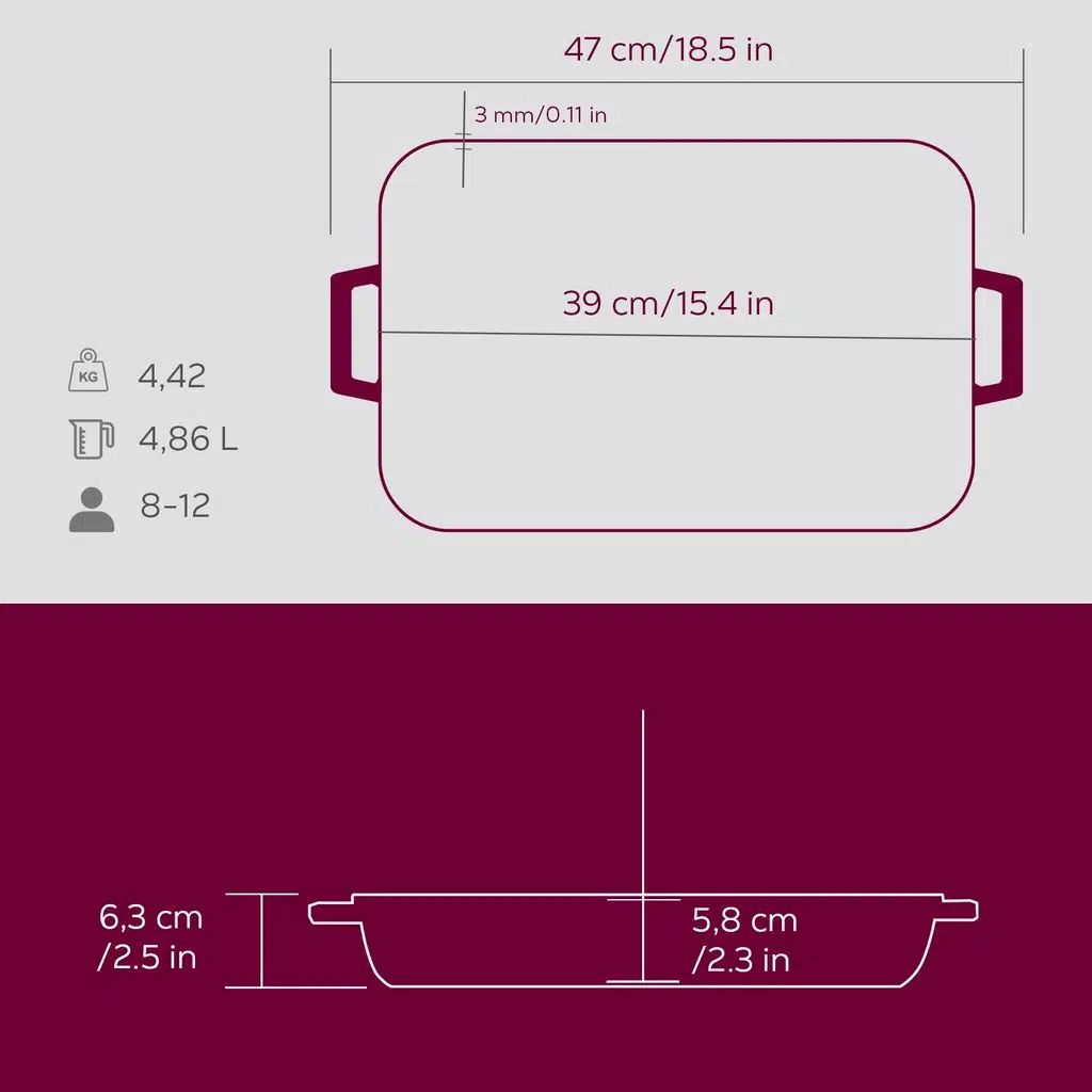 Cu o capacitate de 4,86 l, tava are 3 straturi groase de email la exterior si un finisaj mat negru la interior, avand grosimea bazei de 5 mm si partile laterale 3 mm.