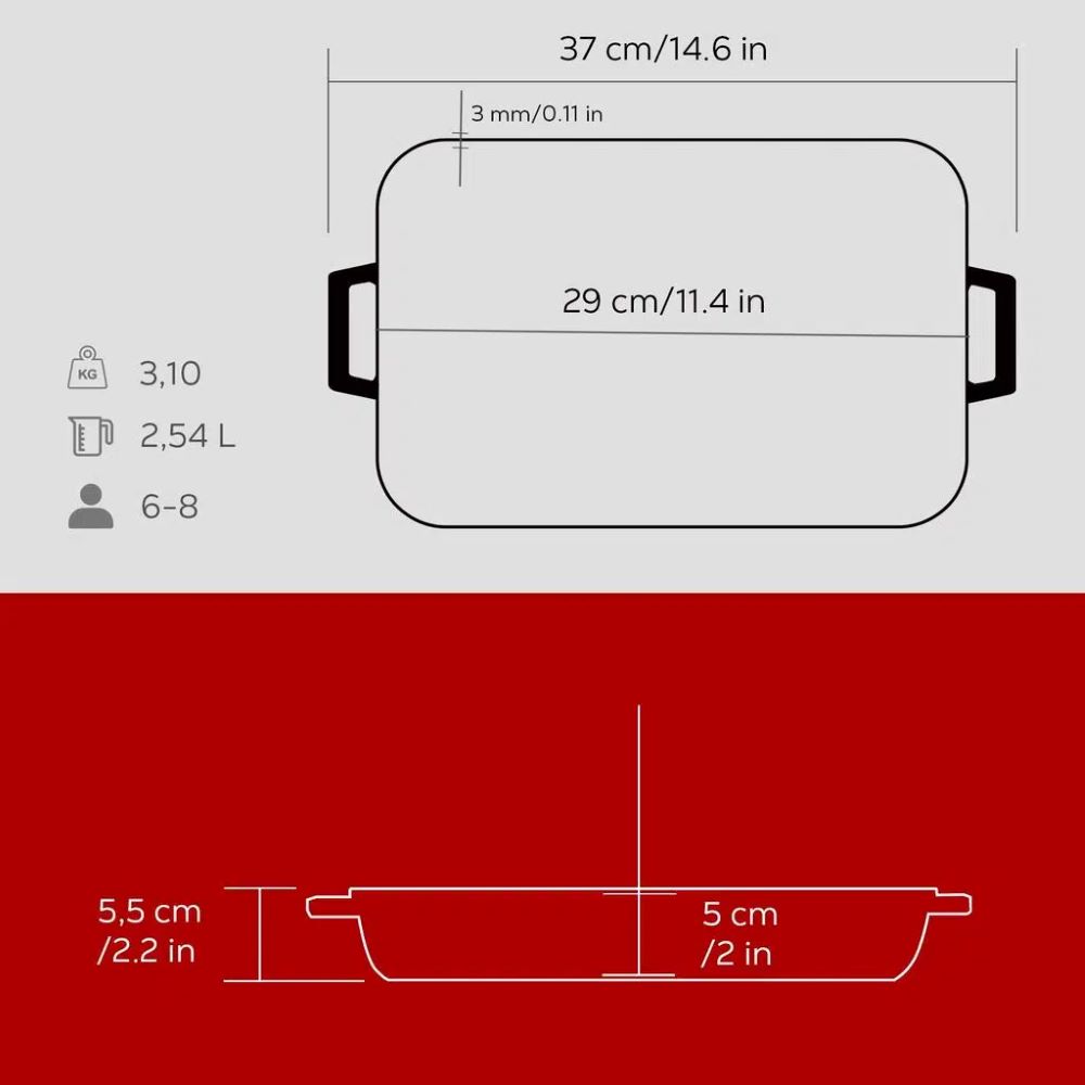 Cu o capacitate de 2,54 l, tava are 3 straturi groase de email la exterior si un finisaj mat negru la interior, avand grosimea bazei de 5 mm si partile laterale 3 mm. Tava este supusa de 2 ori procesului de ardere pentru o durabilitate sporita si o performanta mai buna de gatire.