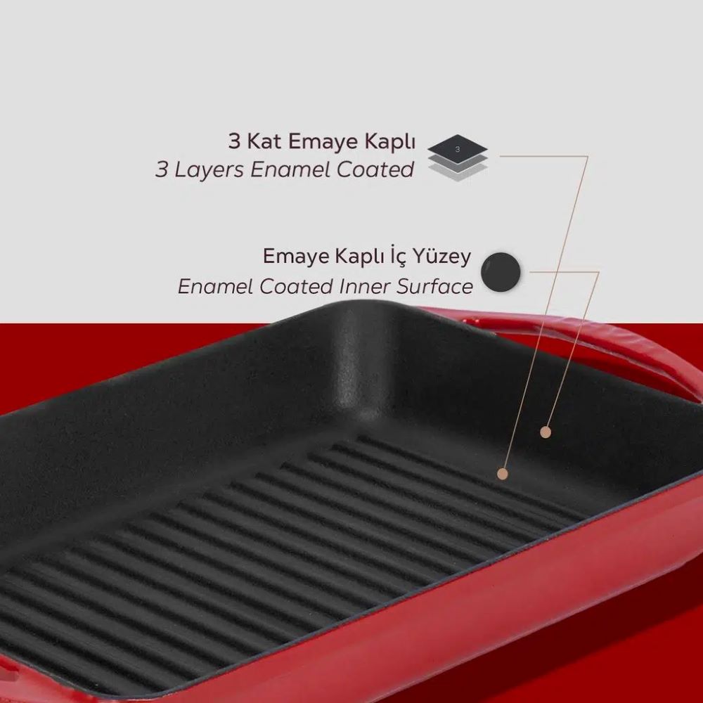 Pregatiti preparate sanatoase si delicioase din carne, carne de pasare sau legume, cu tava grill din fonta emailata LAVA! Datorita calitatilor excelente de retinere si distributie uniforma a caldurii, tava grill este perfecta pentru a obtine un gust asemanator retetelor pregatite pe gratar!