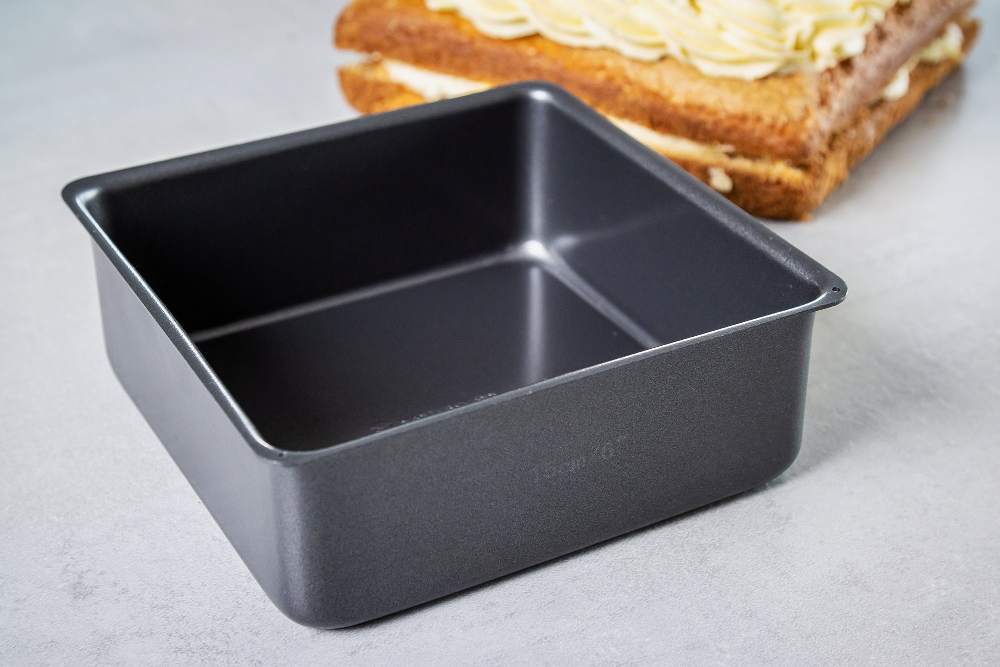 Tava patrata pentru copt, marca MasterClass, fabricata din otel carbon, grosime 1 mm, dimensiune 15 x 15 cm, cu suprafata antiadeziva.