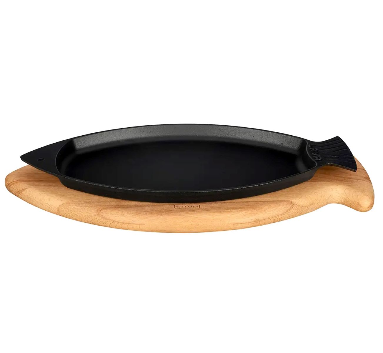 Tava pentru peste cu platou servire, marca LAVA, dimensiuni 32 x 20 cm, capacitate 1,1 L, fabricata din fonta. Tava si platoul din lemn sunt in forma de peste.