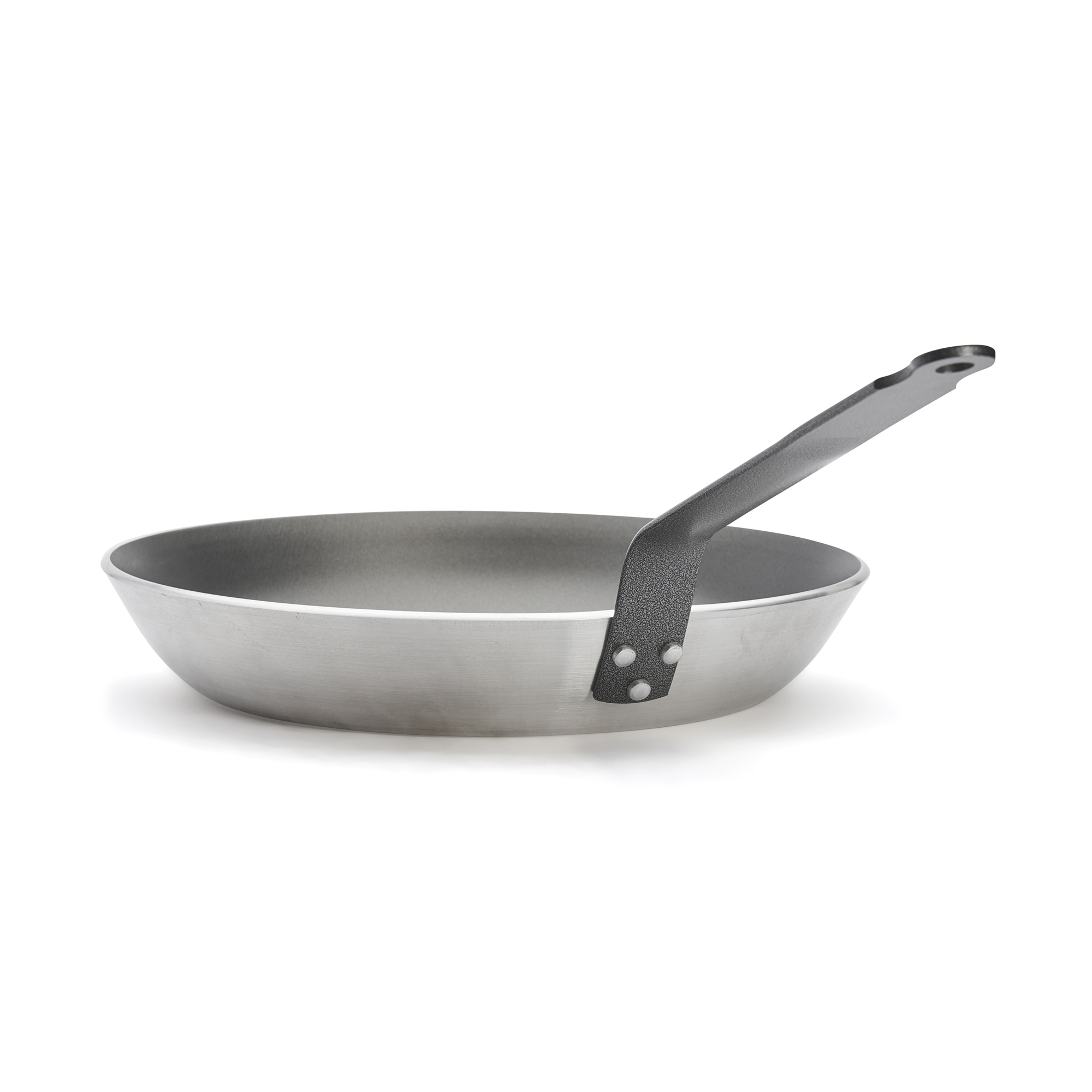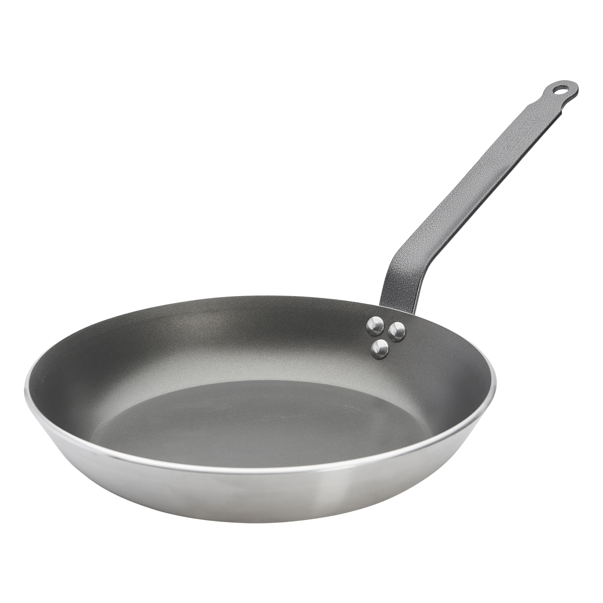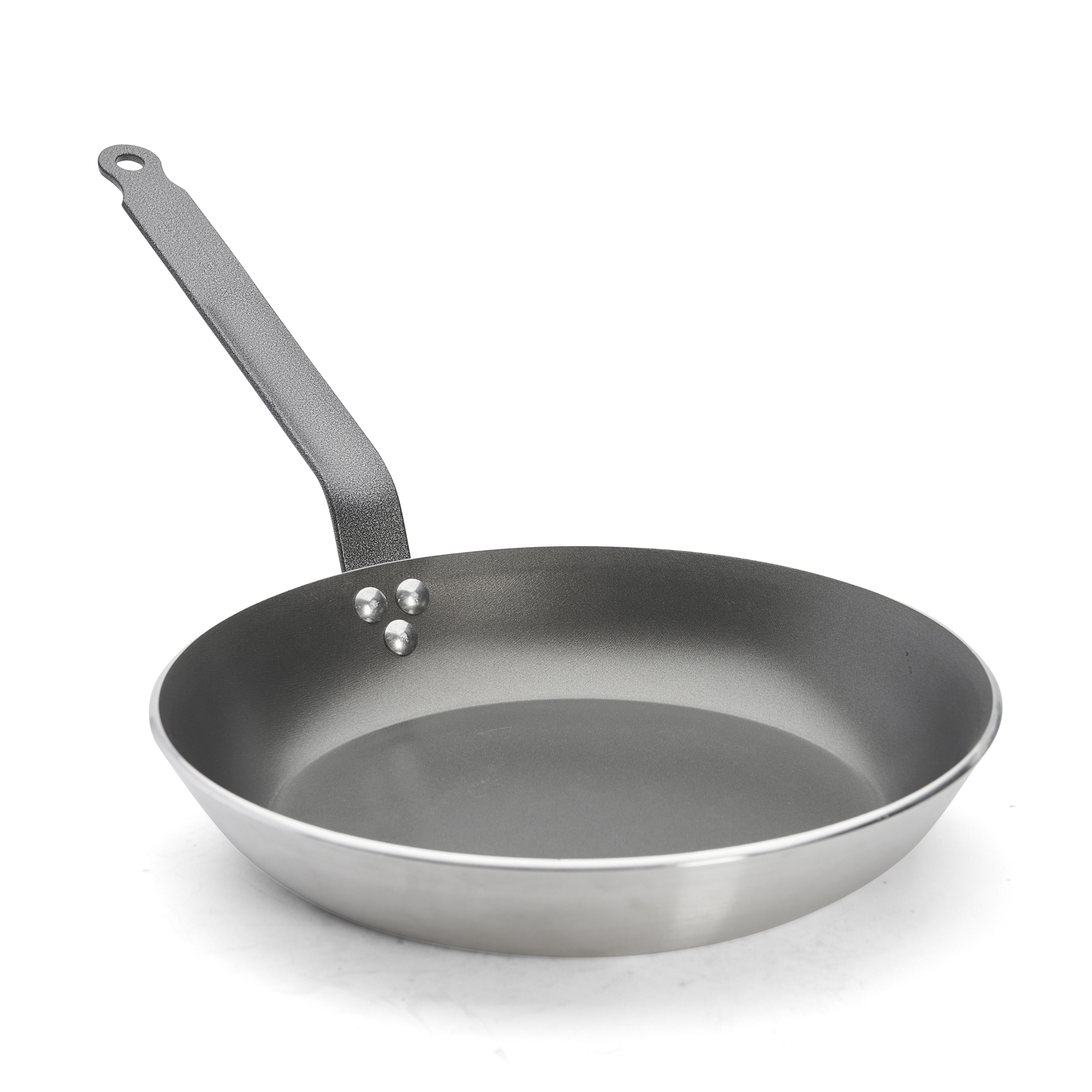 Manerul foarte rezistent al tigaii este fabricat din otel si este prins cu nituri.