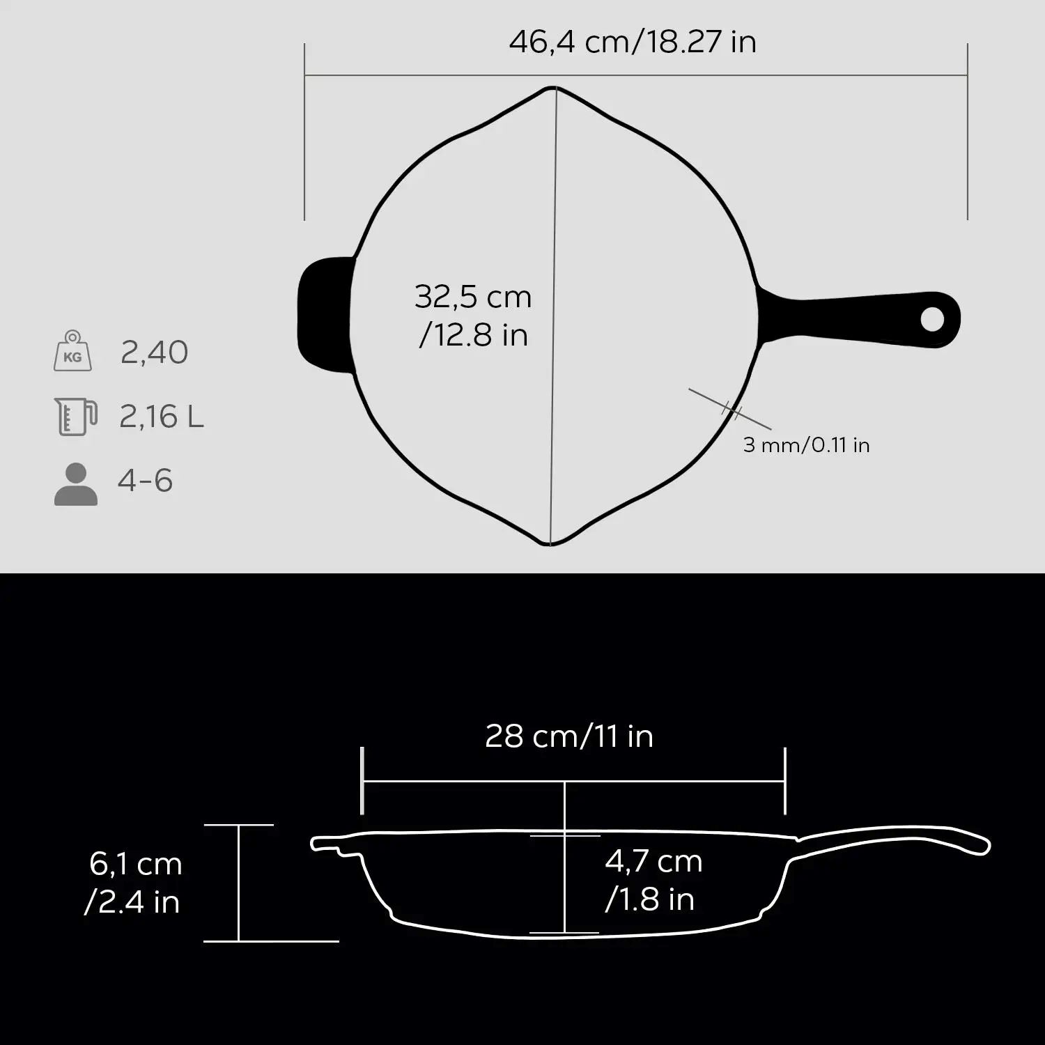 Peretii vasului au o grosime de 3 mm iar in interior, acesta prezinta un strat de email negru ce faciliteaza crearea unei suprafete antiadezive atunci cand se gateste folosind grasimi.